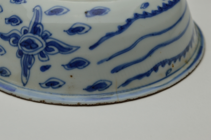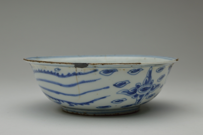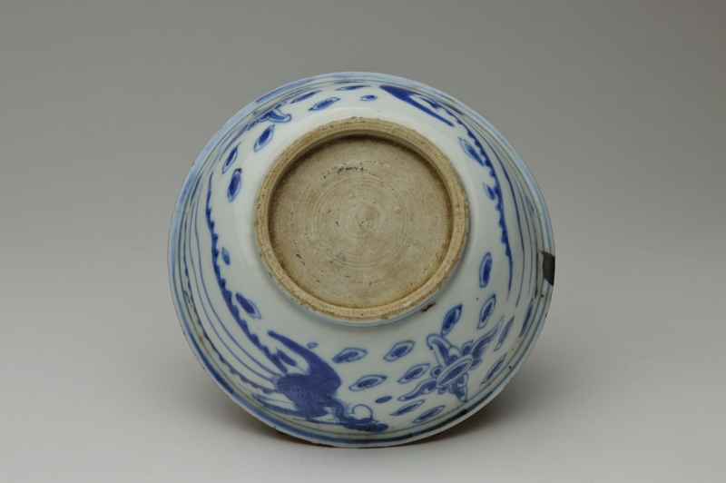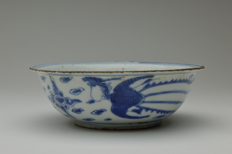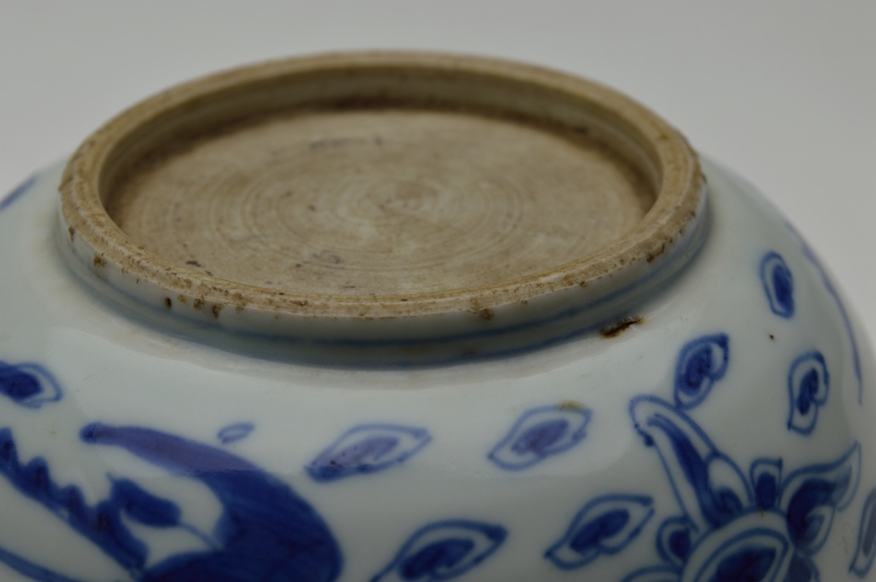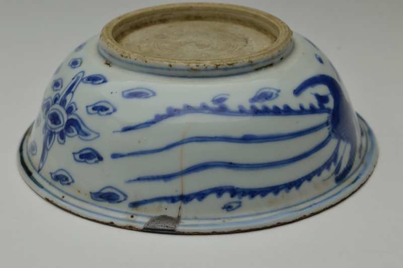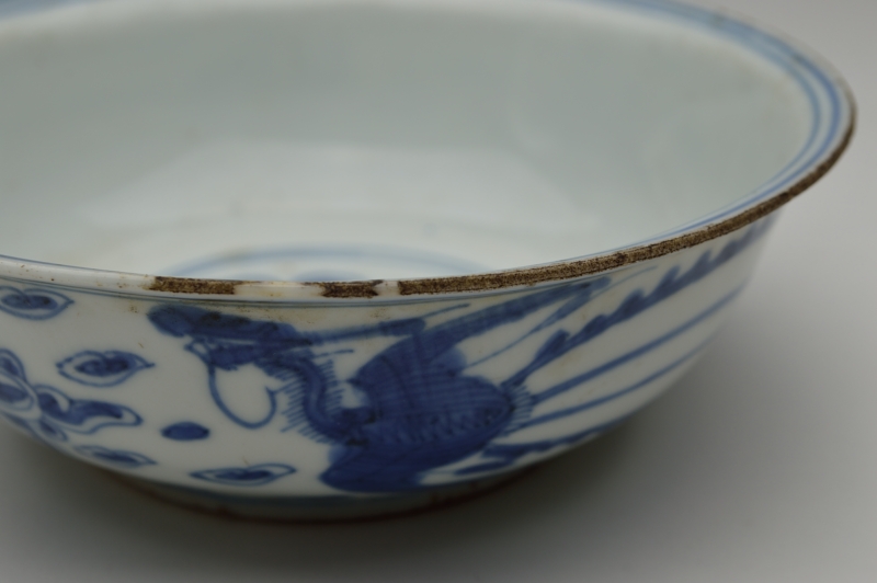 鳳凰の絵が描かれ、見込みの雲がいかにも古染らしく描かれております。薄手でニュウ及び直しがありますが、ご使用可能な状態と判断しております。高台には釉薬が掛かっておらず特有の削りの跡も見られます。虫食い、ニュウ、直しがございますので充分ご確認の上ご注文ください。明末〜清初。