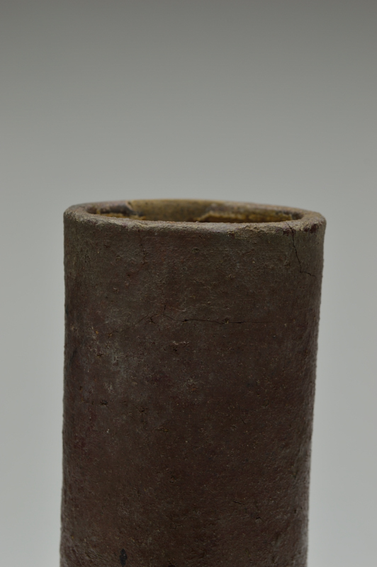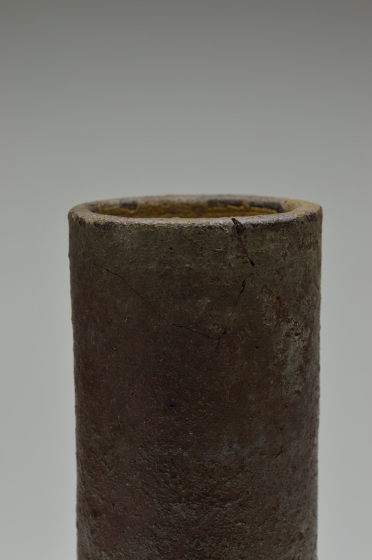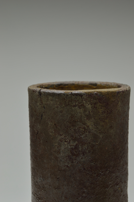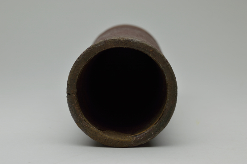 シンプルな円柱型の常滑の仏花器。時代は江戸の終わり頃のものかと思います、余計な意匠のない形はどんな花も受けとめる懐の深さを感じます。残念ながら縁周りにカケ、ひび、ニュウがあり完品ではございませんが下部にむかってはニュウが入っていないので水漏れは心配ありません。カケの補修も簡易的なもので、ニュウもございますので完好品ではございません。充分画像をご確認、状態にご理解の上ご注文下さい。