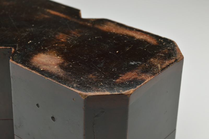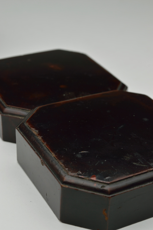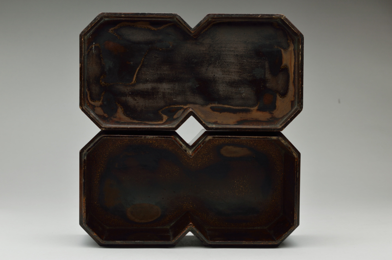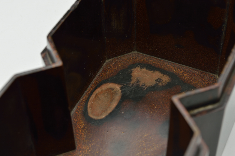 漆黒で仕上げられ時代経た独特の肌の表情は一色ながらも色々な景色を見せています。現代のデザインでもおかしくない形で木地を手がけた指物師の技術の高さを感じます。中は梨地で使い込まれ擦れなど見られますが上質でしっかりとした仕事なので、汚い感じはしません。このぐらいの時代のものであれば状態は悪くはないと思います。仕覆はございますが箱はございません。経年による変化、ひび、擦れ、はがれなどはござますので充分ご理解、ご確認の上ご注文下さい。ご不明な点などございましたらお気兼ねなくご連絡下さい。江戸初期。