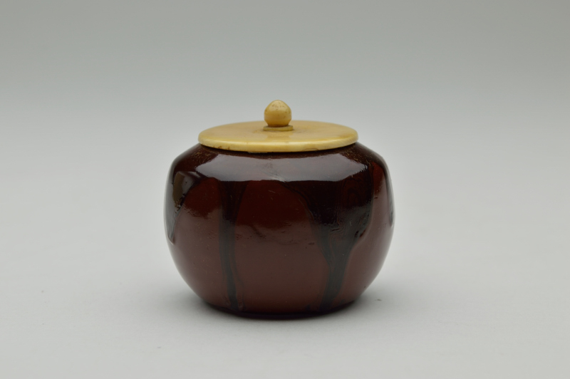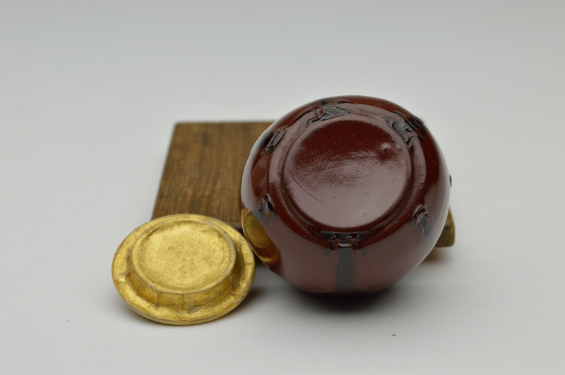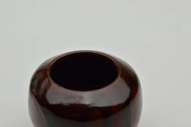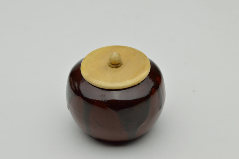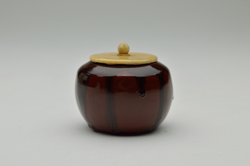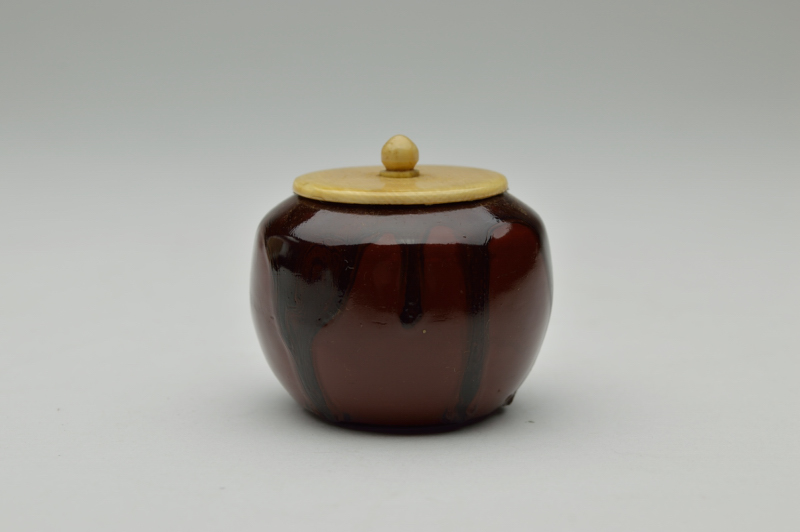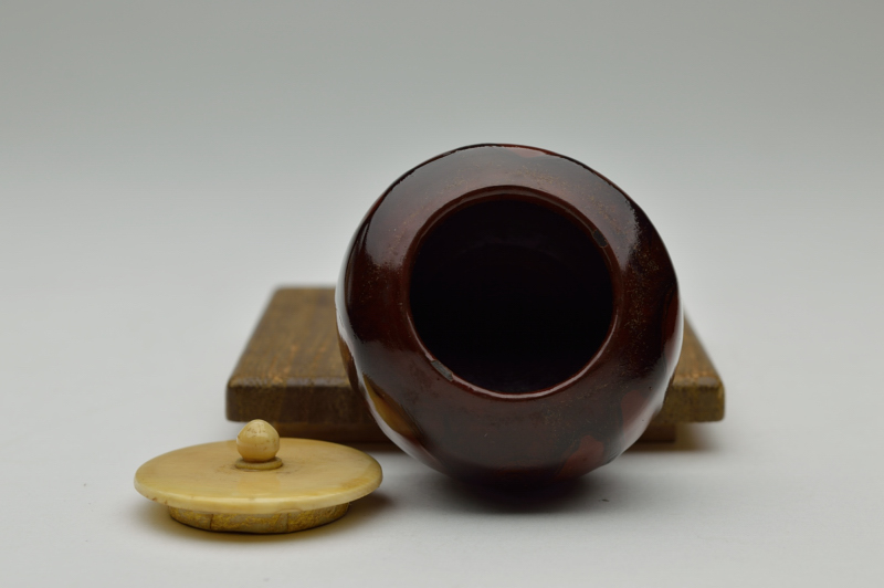 まるで焼物のように見えますが漆器です。垂れももちろん漆。このような、焼物そっくりの漆器は柴田是晋の影響を受けた作られたものでしょうか。牙蓋で仕覆付、良い味の箱もございますが養生箱とお考え下さい。大きな欠点はなく状態は極めて良好。このサイズだと茶箱にぴったりです。