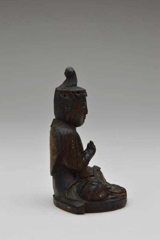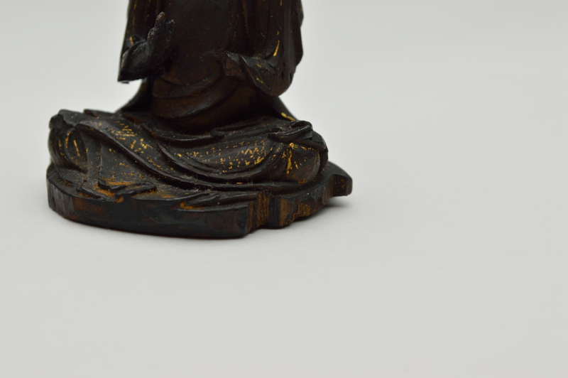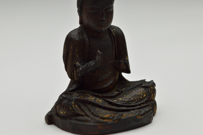 両手は失われておりますが魅力は失われておりません。柔らかな温かみのある表情で小ぶりのものながら丁寧に彫られております。脚部に残る截金の文様が残っているのも嬉しいところです。お顔が少し大きめのバランスも愛くるしさを感じます。桃山〜江戸初。箱、厨子はございません。