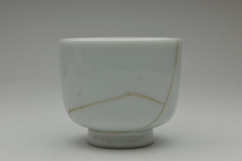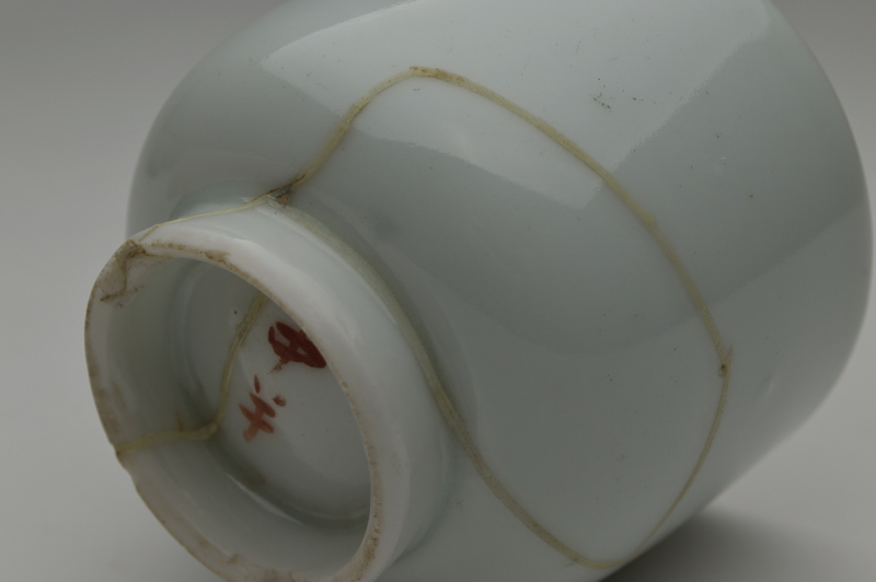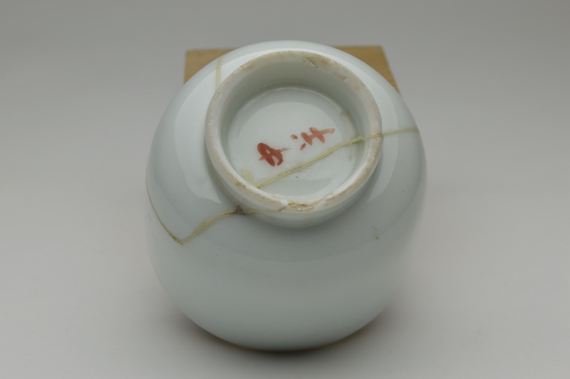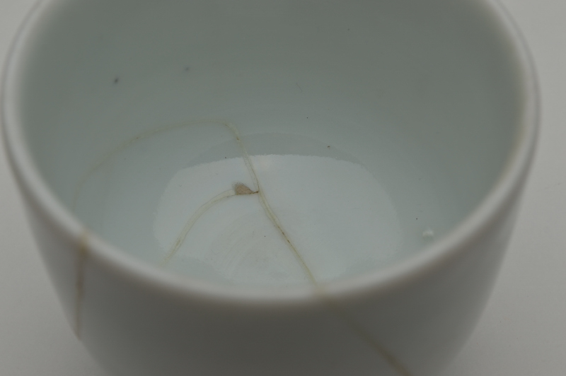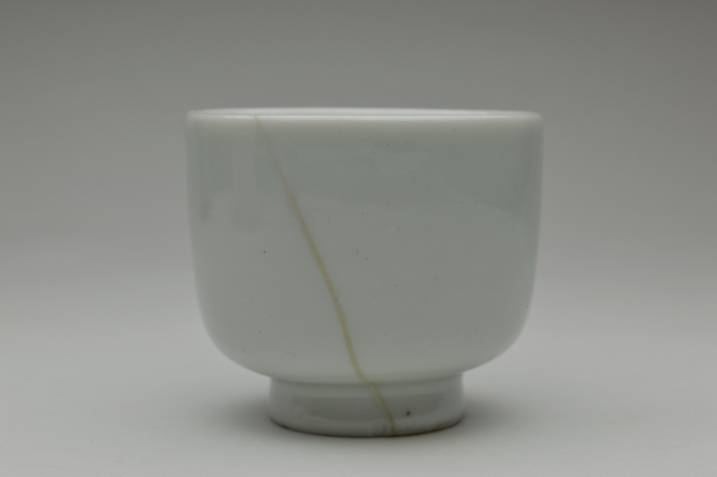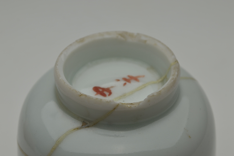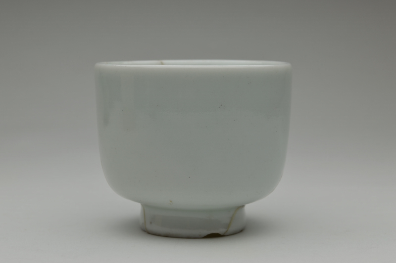 透き通るような少し青みのある綺麗に焼き上がった白磁筒型茶碗(向付かも)。残念なことに焼き継ぎで直されていますが、堅牢な直しですので充分使って楽しんでいただける品。しっかりと焼き上がった磁器らしい綺麗な表情で、完品だったならばと惜しまれます。片手に納まるサイズでたくさん呑まれる方には酒器としてもいけるサイズですし、茶箱に収めても宜しいかと思います。焼き継ぎ以外に、窯からのものなのか高台にカケ、見込みに少し割れた際にできたチップがあります。あくまでも参考品とお考えの上御注文下さい。