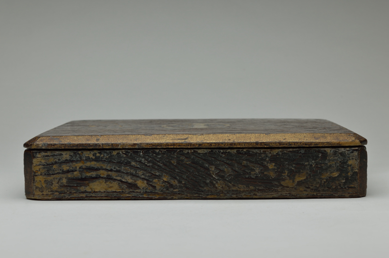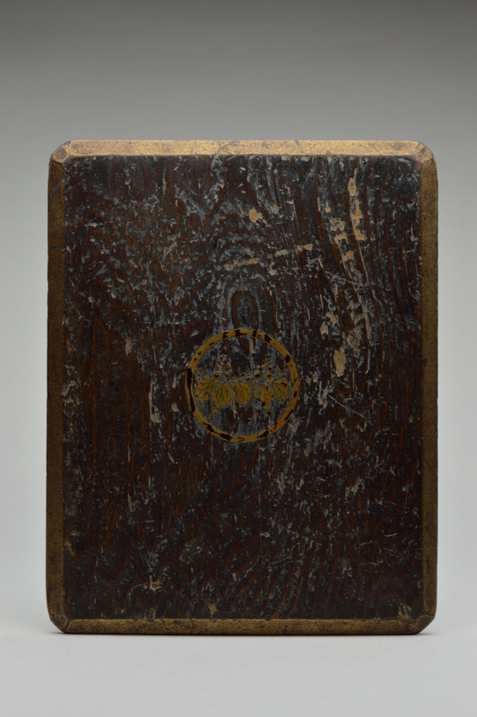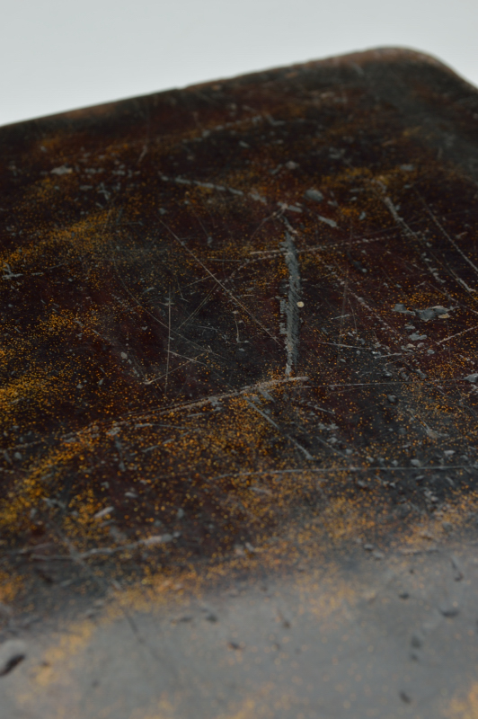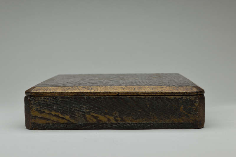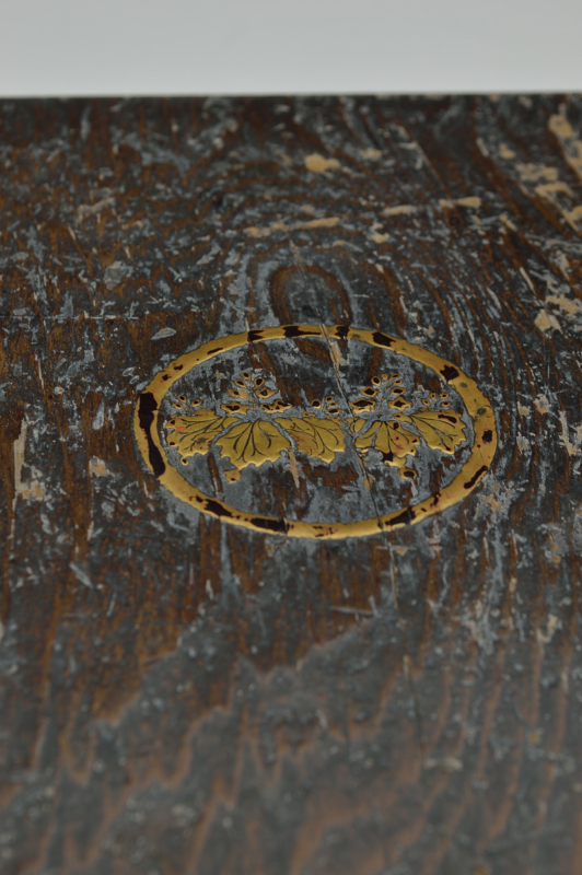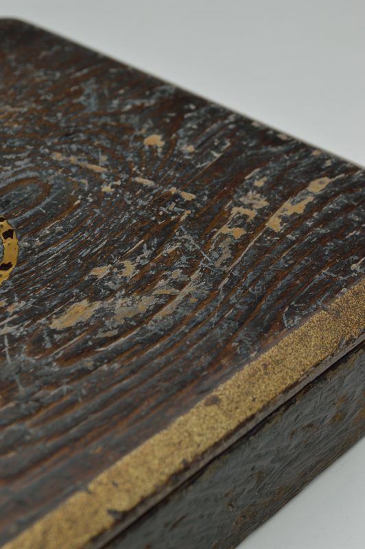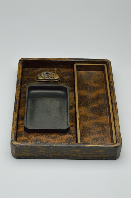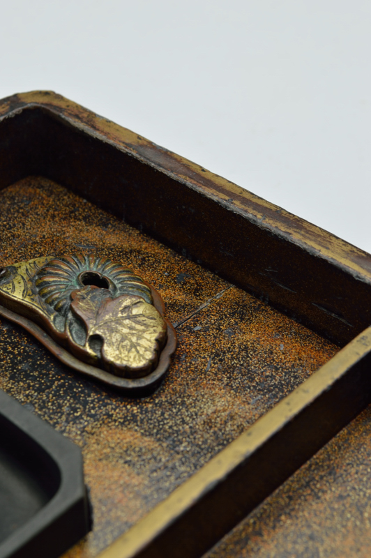木地の木目を生かした渋い仕上がりの硯箱。表には2つの桐が並ぶ紋で内側は梨地で質素ながらも気品を感じます。水滴も鍍金が残る菊をあしらったものですので出自の良さを容易に想像できます。公家のものでしょうか。漆の仕上げを見る限り時代を感じますし、水滴に関しては充分時代がございます。簡素なもので非常に気品を感じる品です。禅宗の影響を強く受けた東山文化の匂いを強く感じます。時代相応の経年変化が見られます。また使い込まれた感じの表情ですので擦れなどのありますので充分画像で御確認下さい。