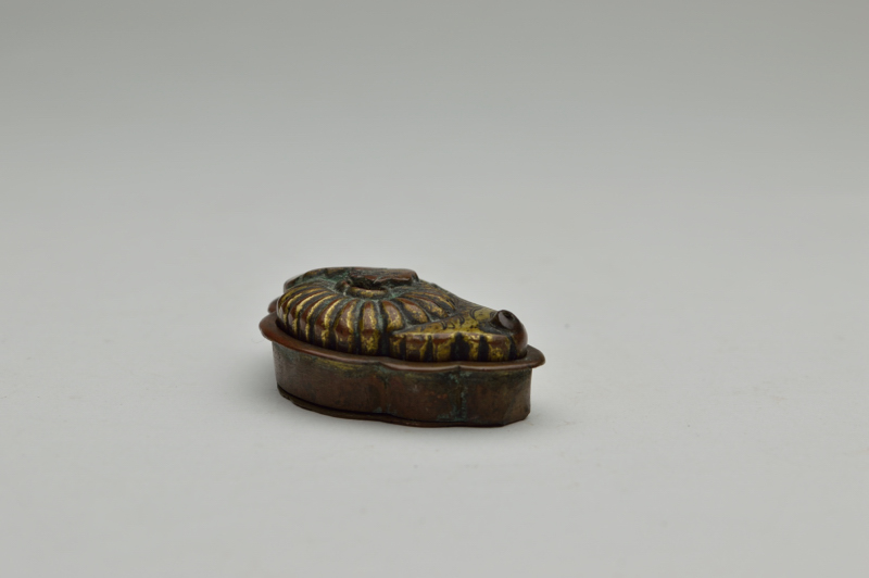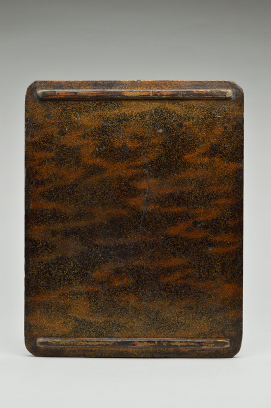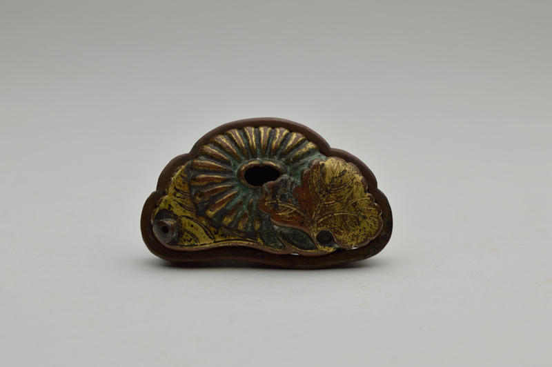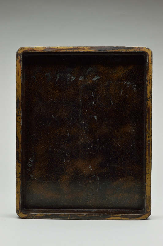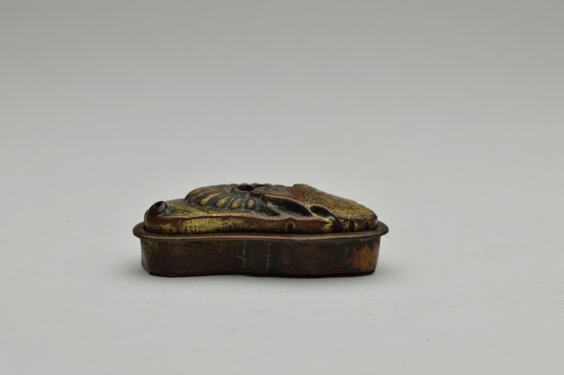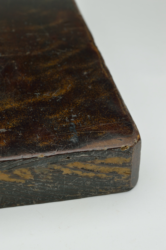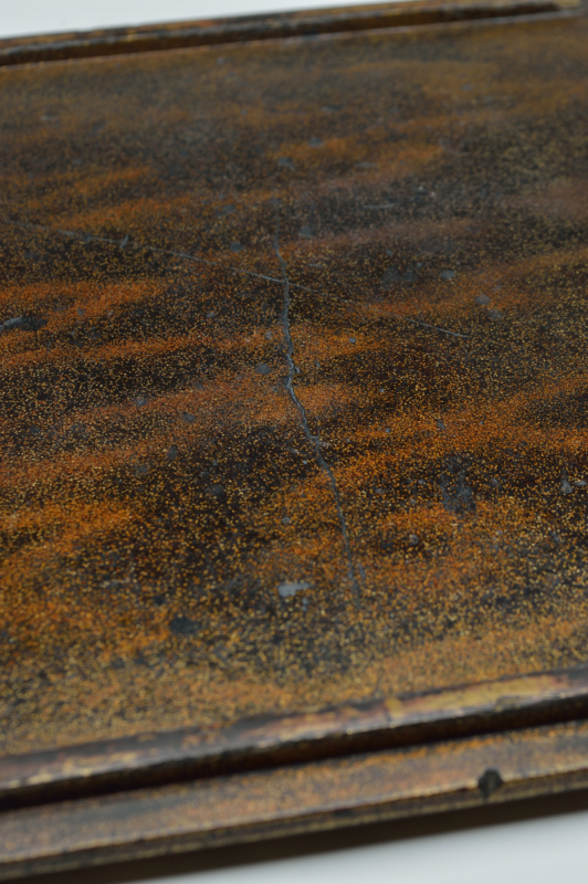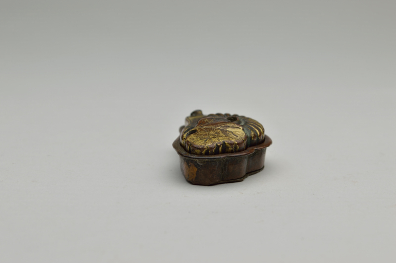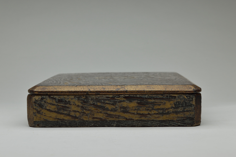 木地の木目を生かした渋い仕上がりの硯箱。表には2つの桐が並ぶ紋で内側は梨地で質素ながらも気品を感じます。水滴も鍍金が残る菊をあしらったものですので出自の良さを容易に想像できます。公家のものでしょうか。漆の仕上げを見る限り時代を感じますし、水滴に関しては充分時代がございます。簡素なもので非常に気品を感じる品です。禅宗の影響を強く受けた東山文化の匂いを強く感じます。時代相応の経年変化が見られます。また使い込まれた感じの表情ですので擦れなどのありますので充分画像で御確認下さい。