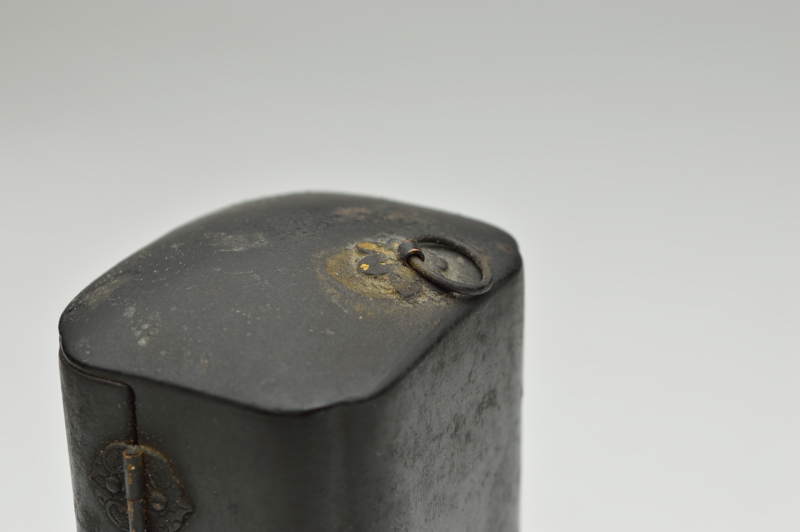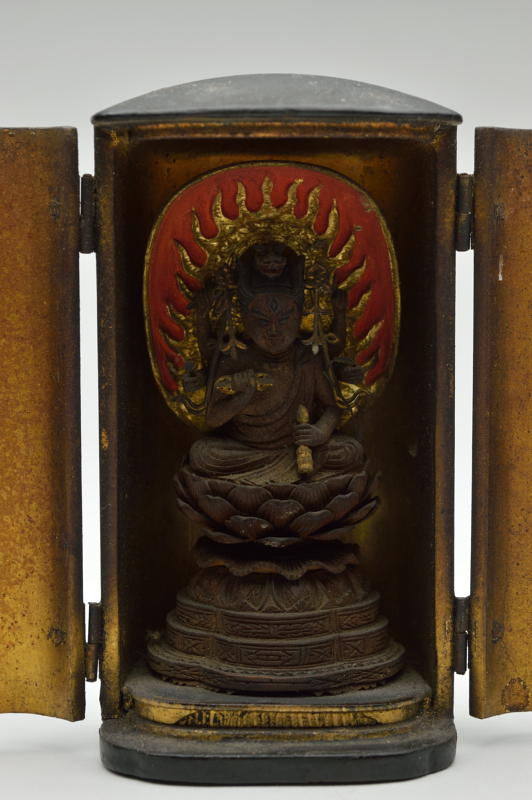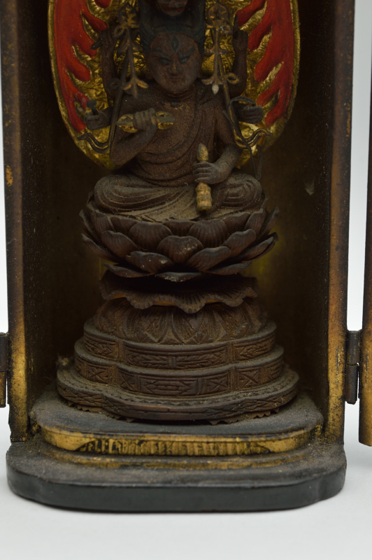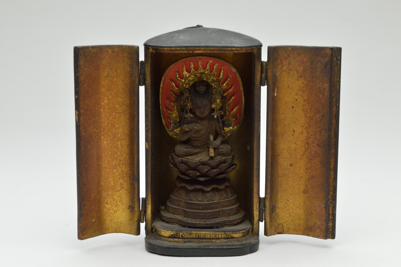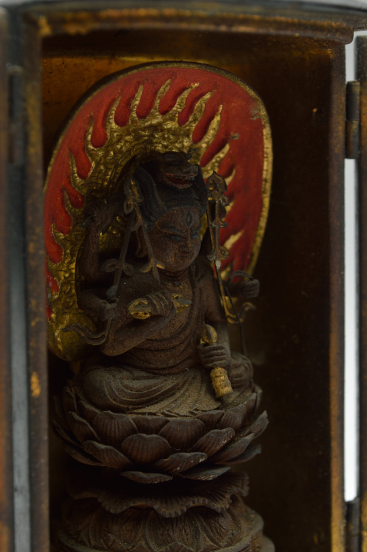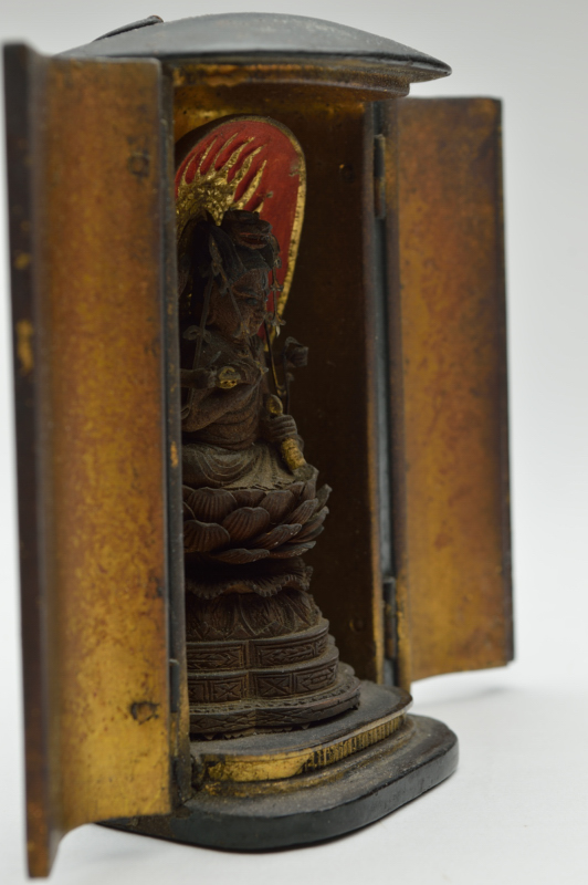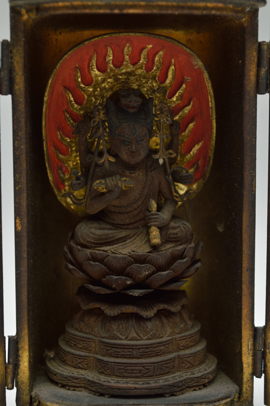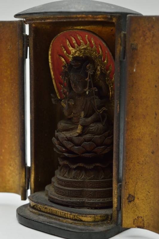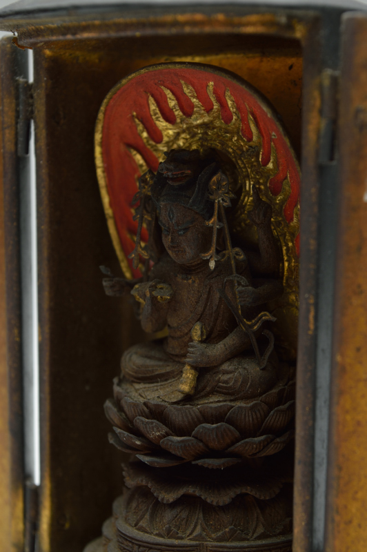 懐中用の厨子に入った小さな木彫の愛染明王。人間の愛欲をそのまま悟りに導く、一面三目六臂の特徴ある姿をした真言密教の明王です。密教仏の中でも、数は少ないですものでましてや状態がほぼ欠点がないものはなかなか仕入れることが出来ません。小さなものですが彫りも細部まで丁寧で、厳しい表情、種々の武器を手にした姿は小さなものですが迫力満点です。江戸時代。