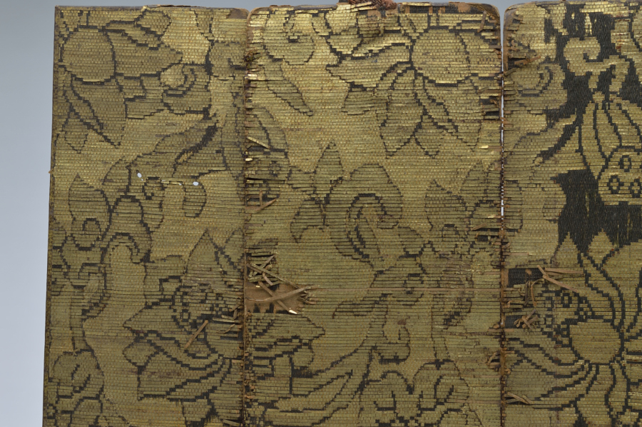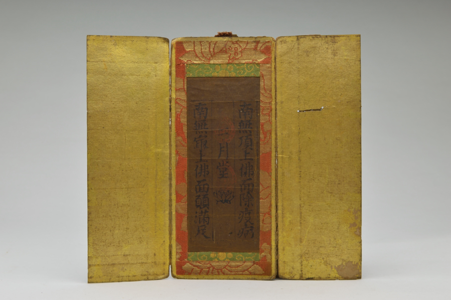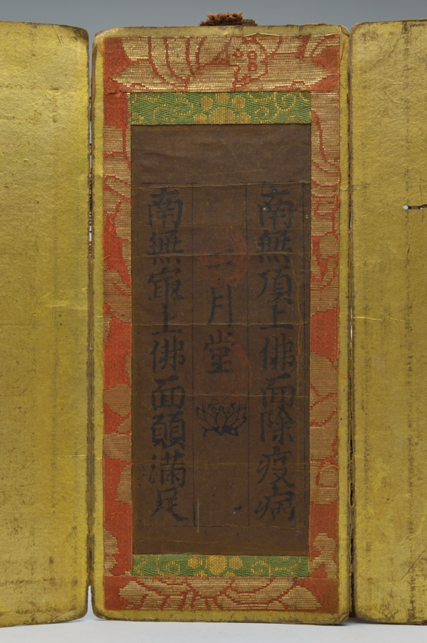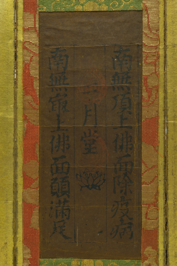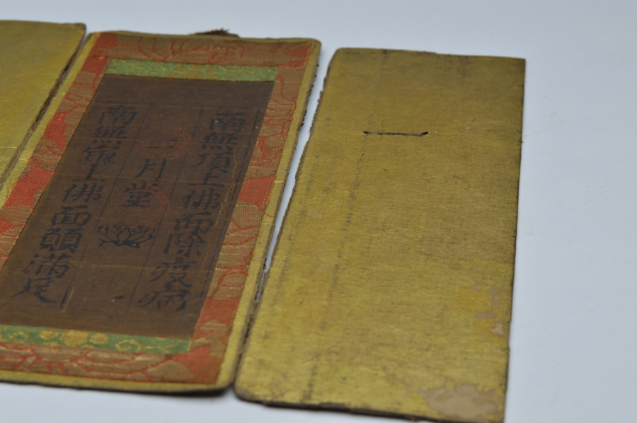 牛玉宝印は修正会、修二会などの神事で刷られるものでその最も典型であるのは東大寺の修二会「お水取り」です。応永19年(1412年)から現在まで信者に配られているものですが古いものはやはり多くはございません。これは懐中用にしていたのか綺麗に表具され大事にされていたものでしょう。その為、牛玉宝印自体の状態は非常に良いと言えます(表の表具はだいぶ痛みがありちぎれる寸前です。お送りする際にちぎれている可能性もあるので予め御了承下さい)。版木も室町期のものと同じものが使われ紙も同様に古いものなので時代は室町と判断しております。