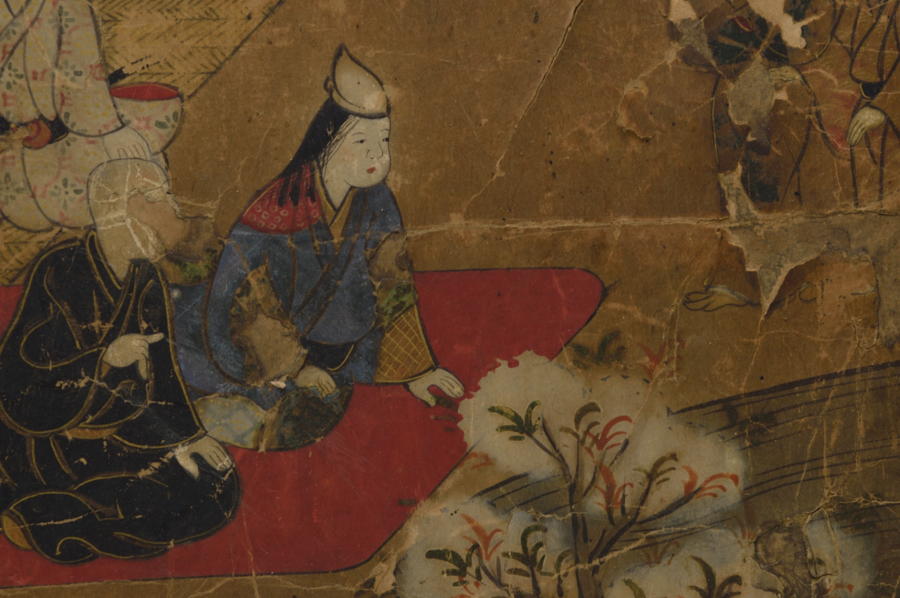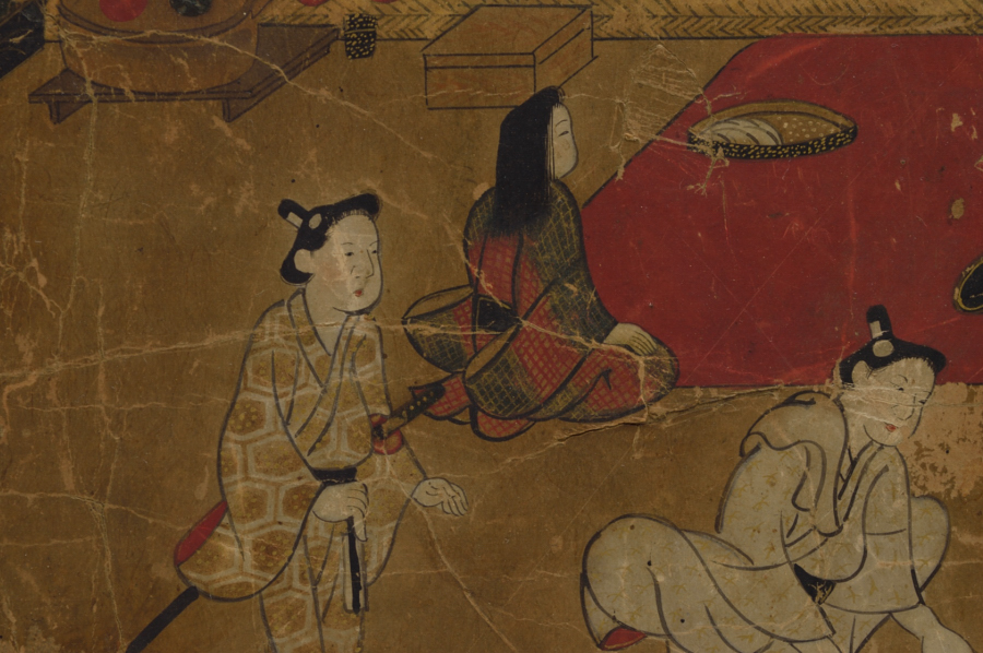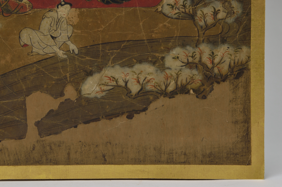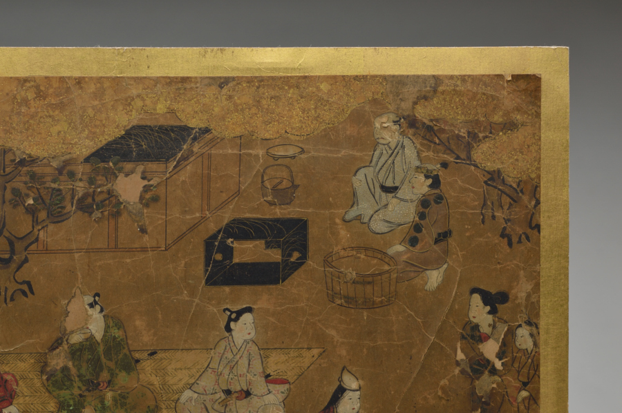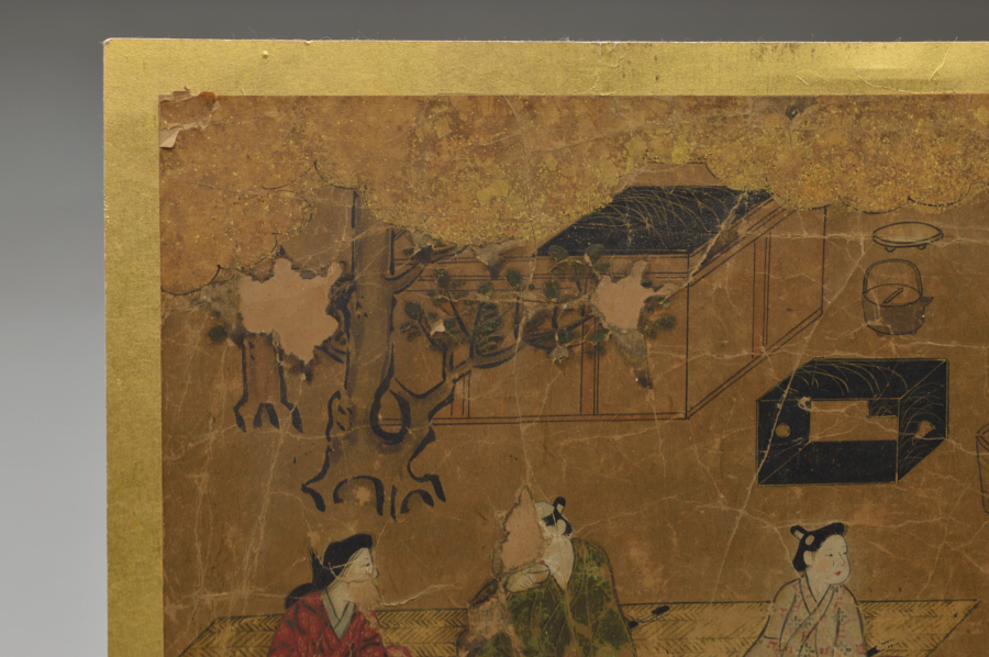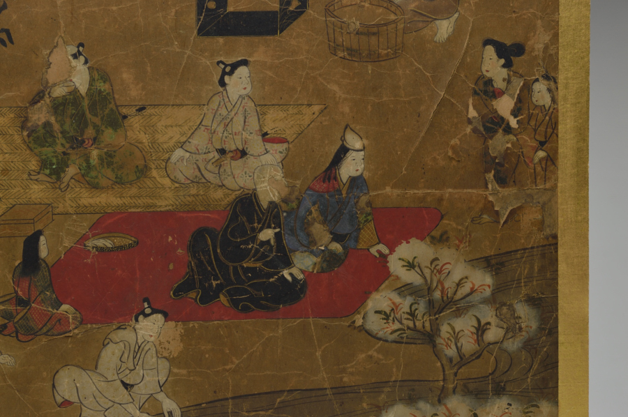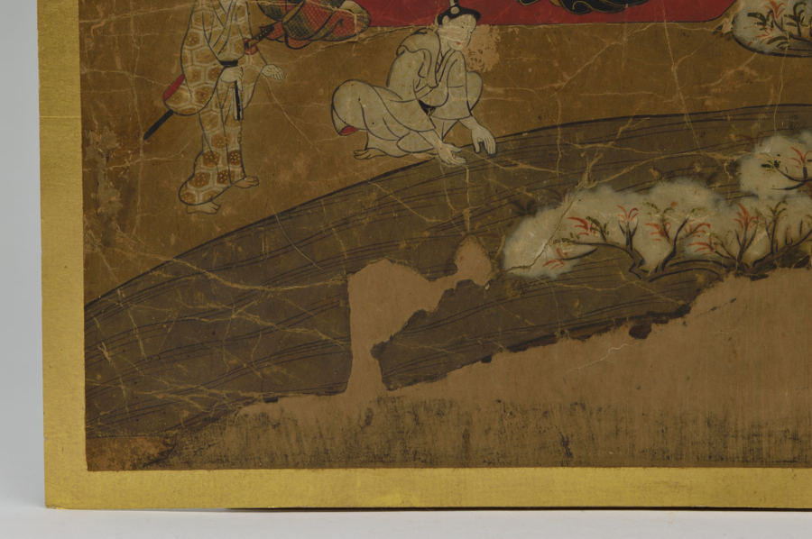 庶民の姿が生き生きと描かれた洛外図の断簡。屏風の一部であったと思われますが裏打ちされ大事にされていたようです。痛みは画像でも御確認できますようにございますし、大きな屏風の一部分ですが充分鑑賞できる魅力があると思います。額はございません。色の変色、破れ、彩色の剝がれ、擦れなどございますので充分御理解のうえ御注文ください。江戸初期。