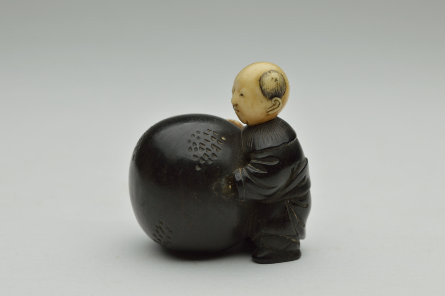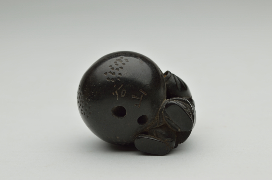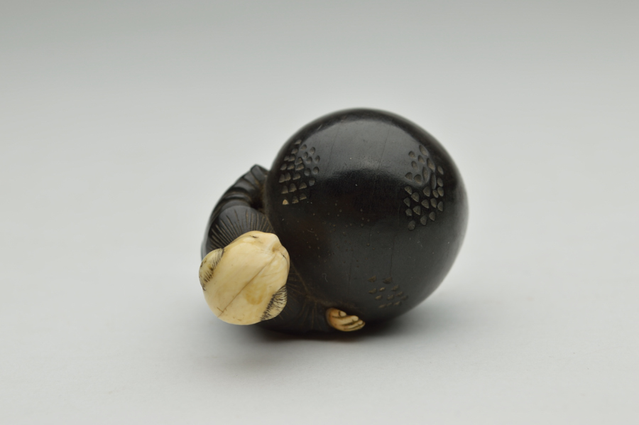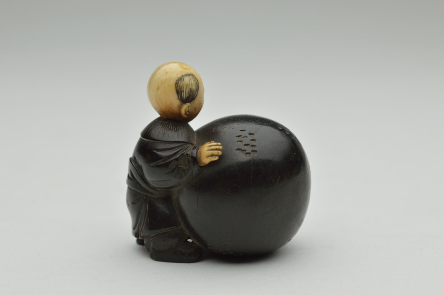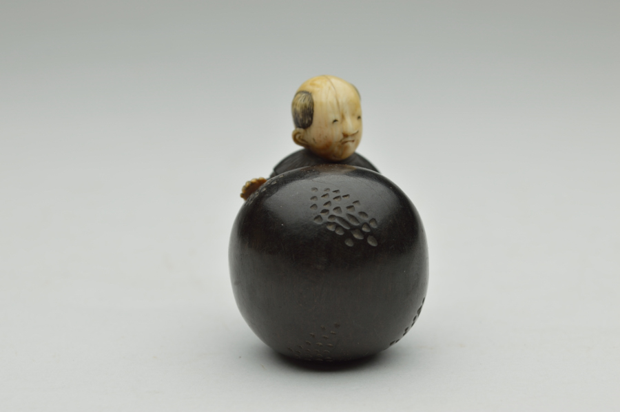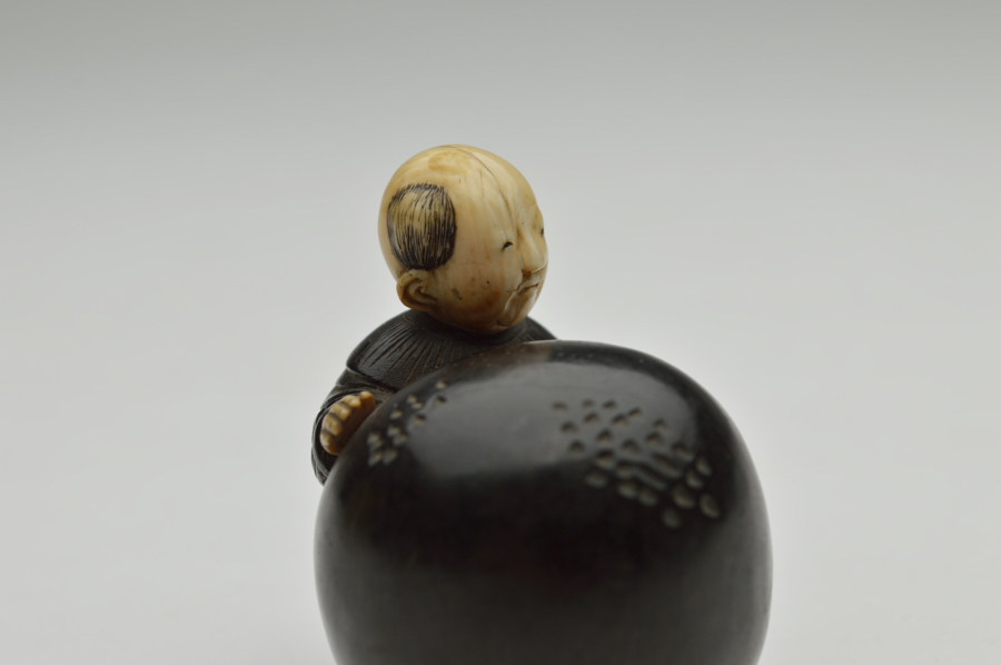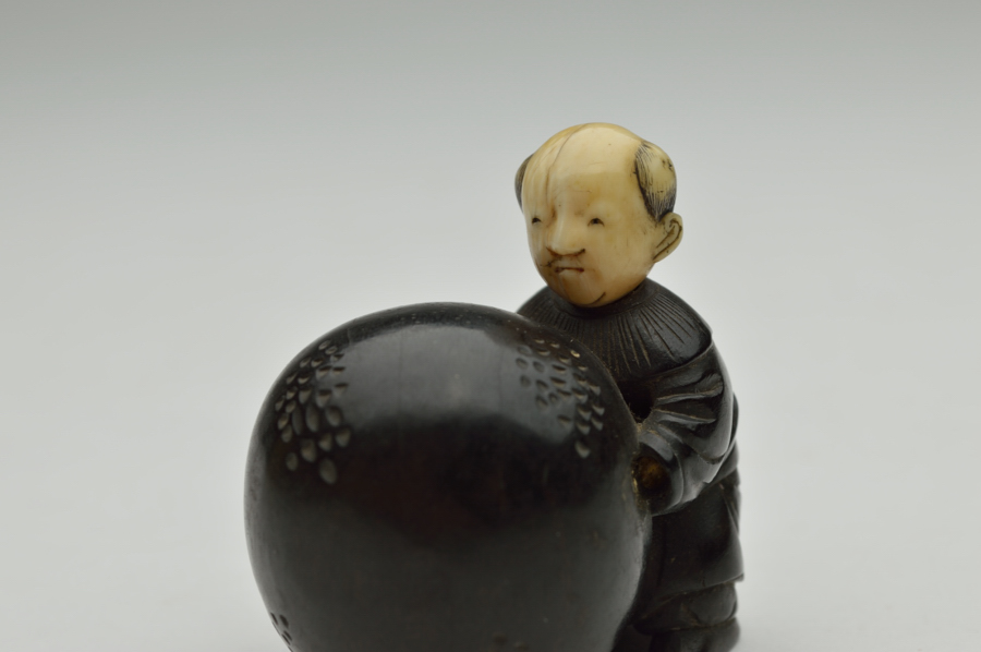 左手が欠損しておりますが、黒檀、鹿角(象牙ではないと思います)の組み合わせの根付。「谷山」の銘有。頭や手などがこのように牙や鹿角で作られたものは以前何度か見たことがございますが、あまり数はないものではないでしょうか。頭部、手の部分はきつく取り付けてありますが差込式になっているようです。手の欠損がございますので充分ご確認の上ご注文下さい。