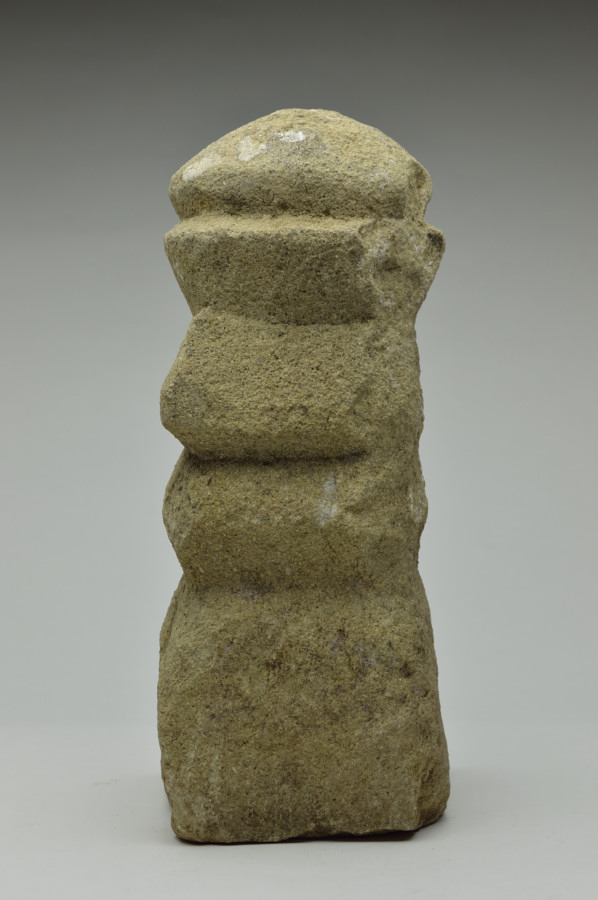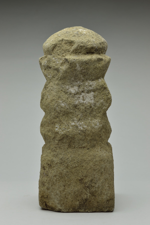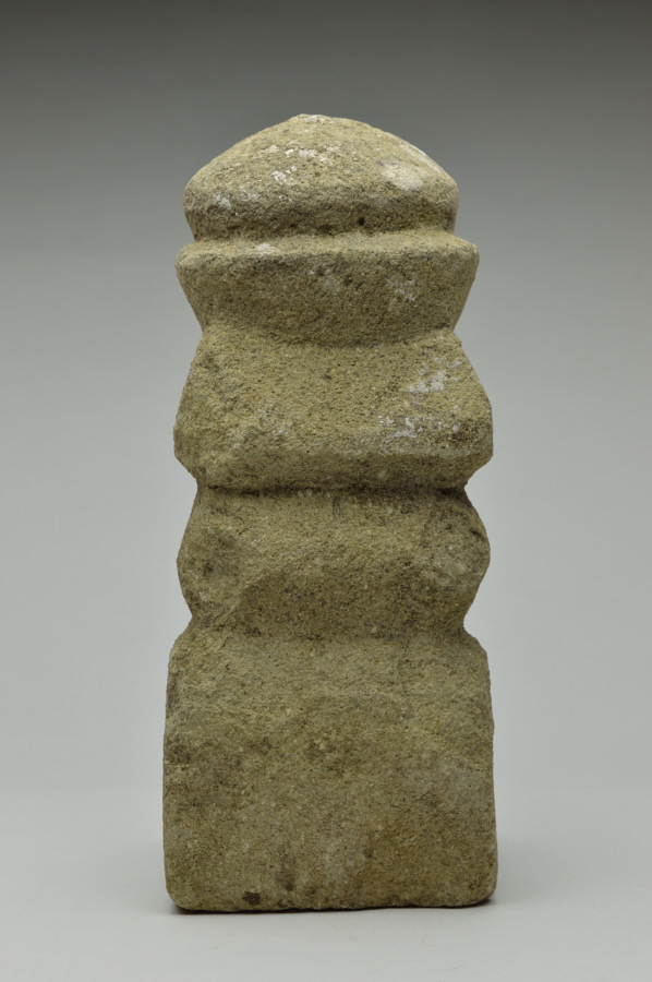 ひとつの石を彫り出して造られた五輪塔。密教の五大思想からなるもので方形(地)、円形(水)、三角形(火)、半月形(風)、宝珠形(空)で構成されております。小ぶりなもので室内でも違和感なく置けます。材質は比較的やわらかな財の凝灰岩と思われます(御影ではありません)。素朴な造形ですが、どっしりとした安定感が風化した表情とあいまって魅力ある姿です。現代の空間においても違和感は感じません。産地不明。