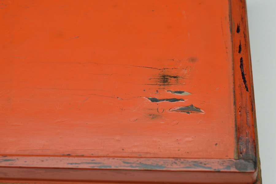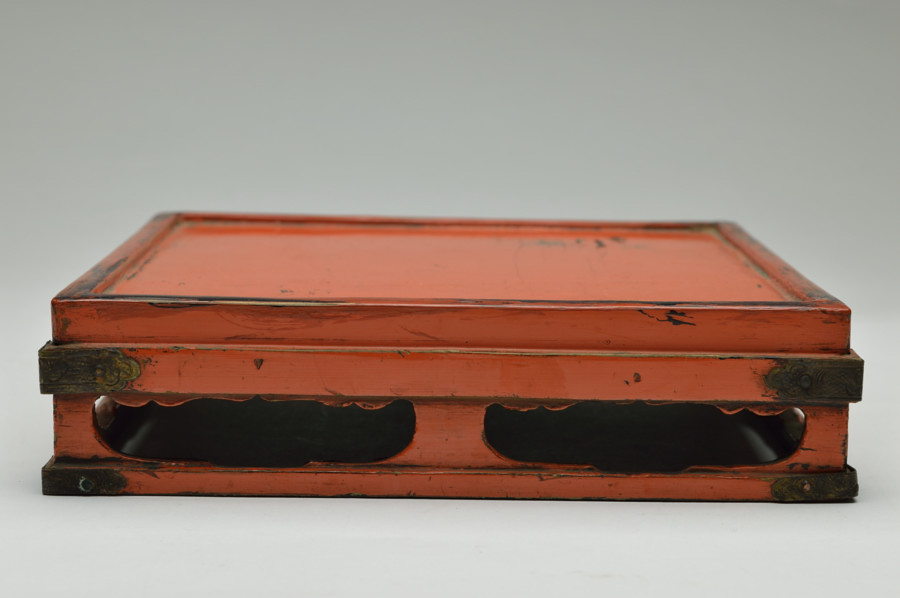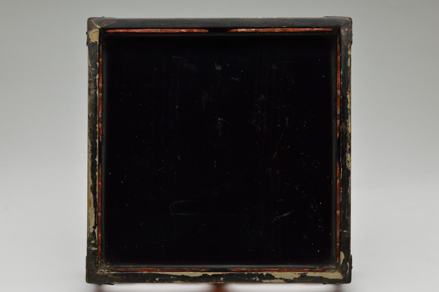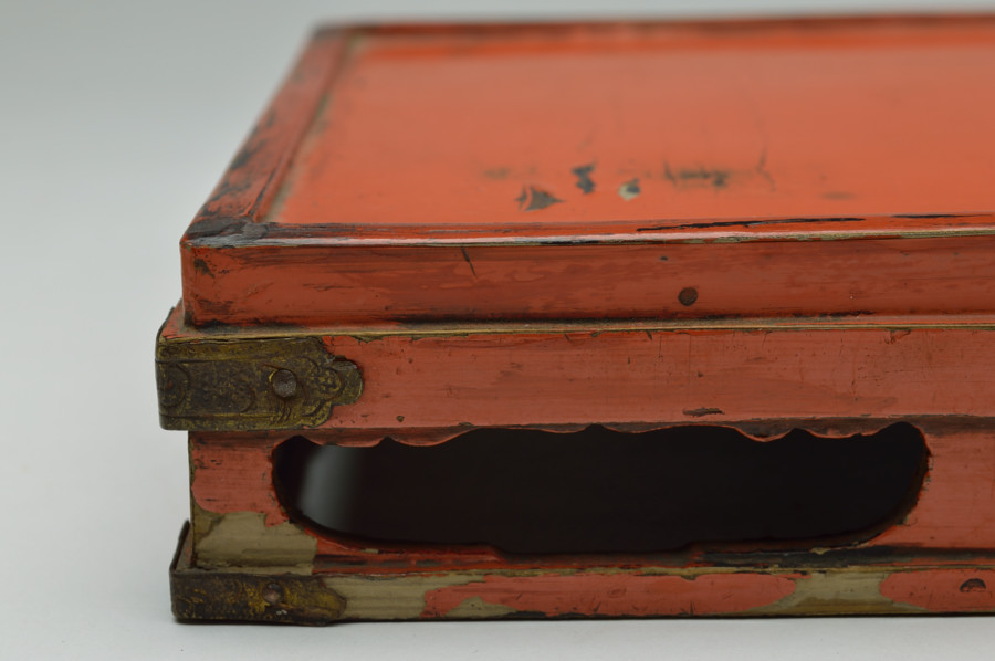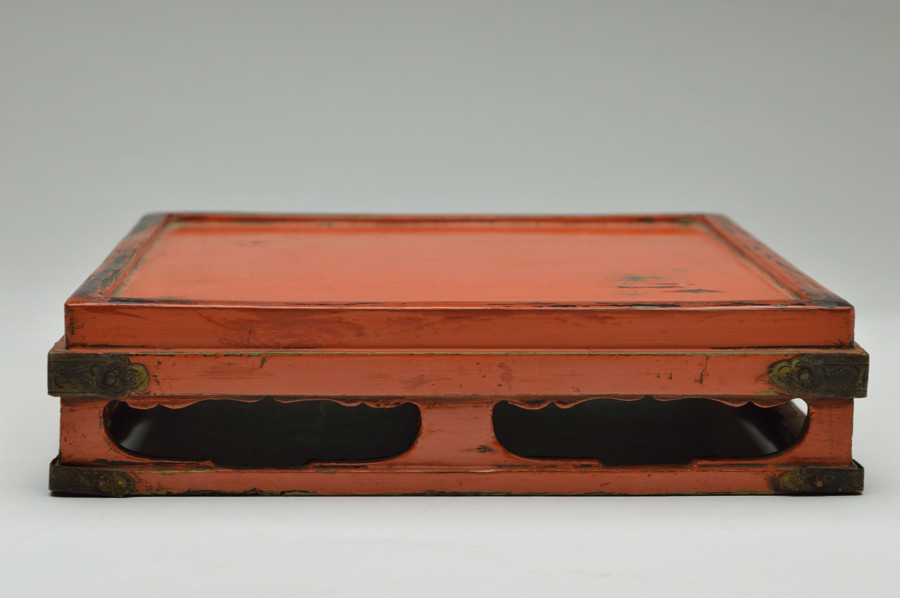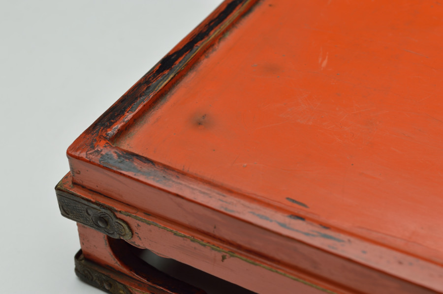 天板部は擦れた朱の下から黒い下地の色が見えます。繊細なつくりの為なのか、塗りの剥がれなどはありますが、このてのものではまずまずの状態だと思います。小ぶりの金銅仏などを飾るのに最適な台かと思います。時代相応の経年による変化、擦れ、剥がれがございますので充分ご理解、画像でご確認の上ご注文ください。