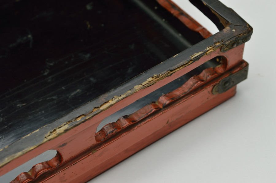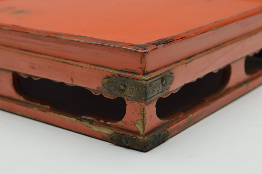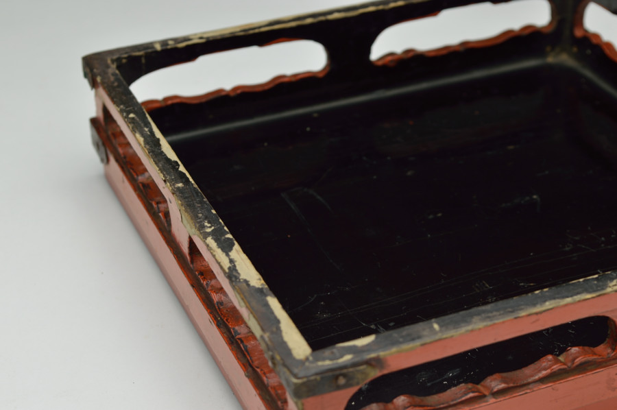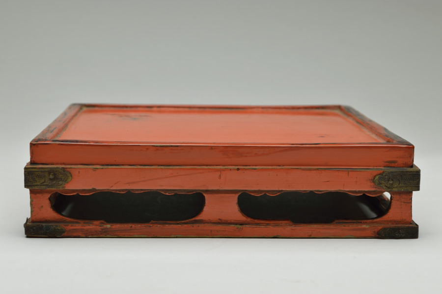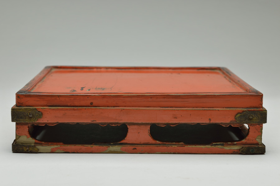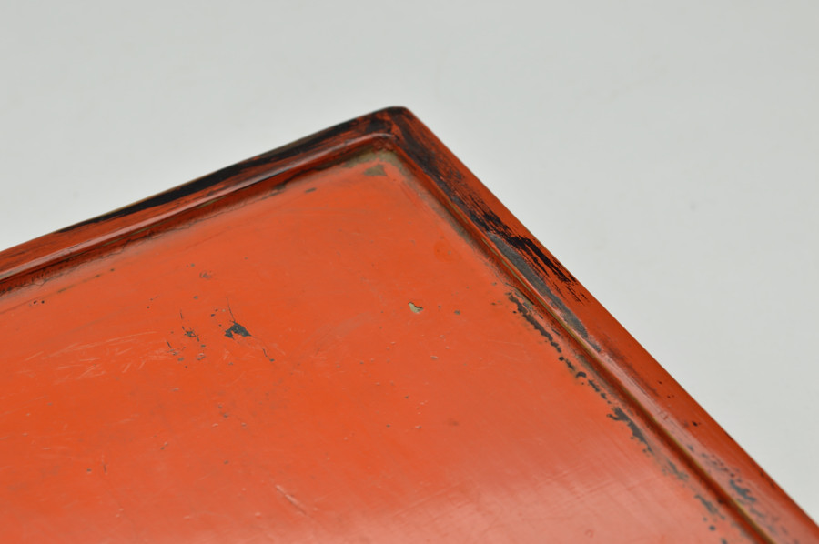 天板部は擦れた朱の下から黒い下地の色が見えます。繊細なつくりの為なのか、塗りの剥がれなどはありますが、このてのものではまずまずの状態だと思います。小ぶりの金銅仏などを飾るのに最適な台かと思います。時代相応の経年による変化、擦れ、剥がれがございますので充分ご理解、画像でご確認の上ご注文ください。