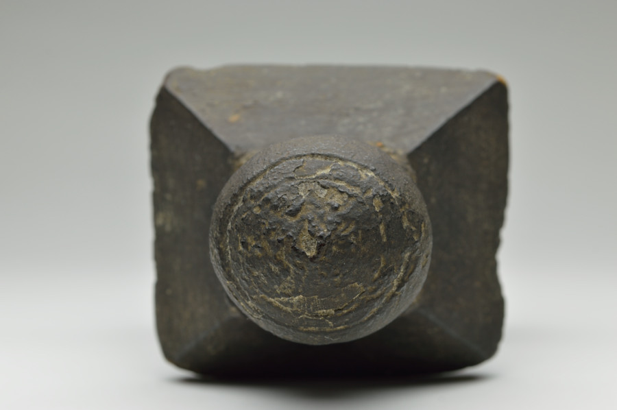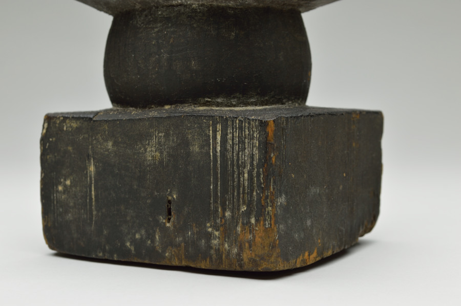 東北で仕入れた木彫の五輪塔。一木で平鑿で掘り出されており、内部には舎利容器などを入れる部分はありません。材は檜などの針葉樹材で非常に軽くなっており長い歳月が経っているのは容易に感じることが出来ます。木彫のこのような造形は石造のものに比べると非常に少なく希少です。庶民の信仰の遺物としても資料的価値の高いものです。一見、素朴で江戸の民間仏のような印象も受けますが、造形やこの地域の古い木彫仏などの造形から判断し中世のものと判断しております。室町以前。
