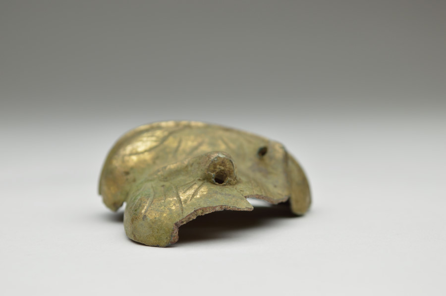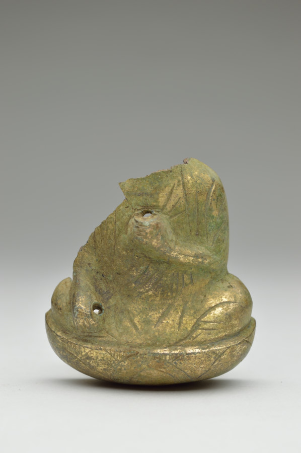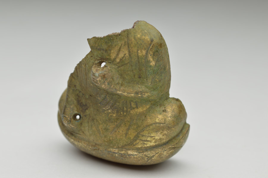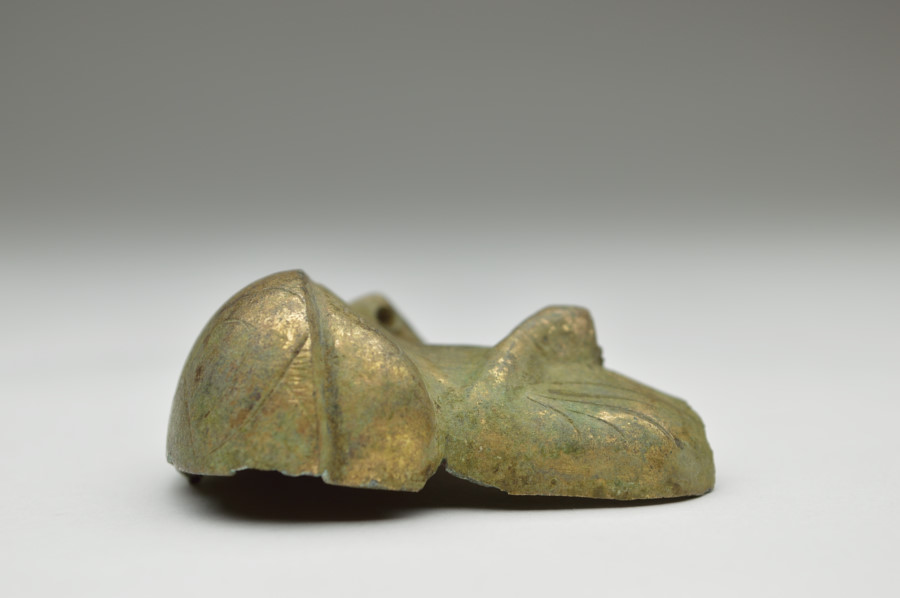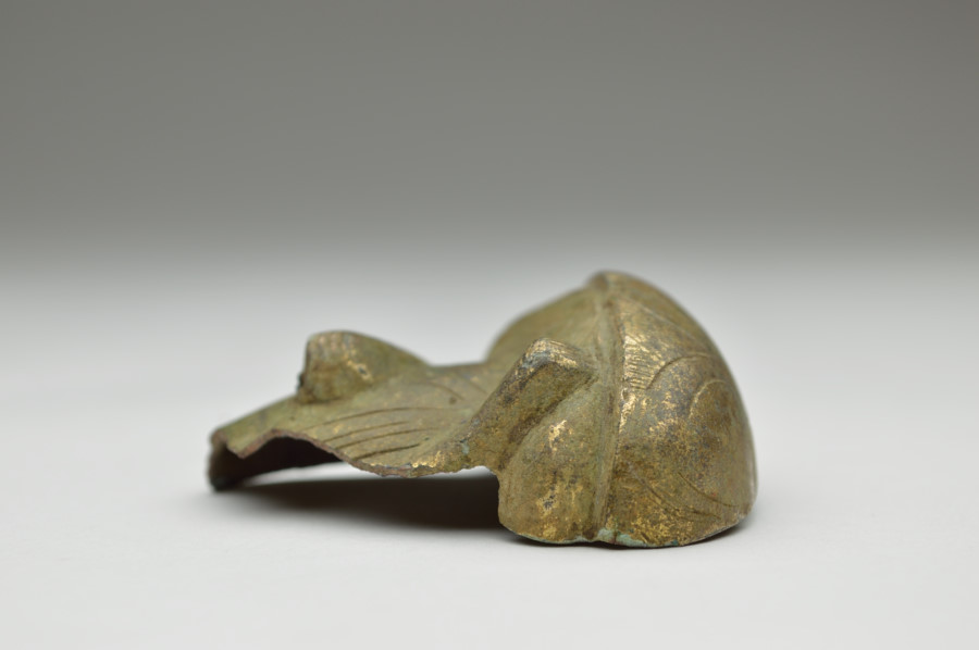 金峯山特有の他とは異なる独特の鍍金の色調、緑青の出具合、鏨で切ったくっきりとした線は金峯山寺経塚出土と判断しております。頭部から右肩ににかけて欠損しておりますが、全体に状態良く残る鍍金は他とは一線を画しています。上部が残っていればと悔やみますが、完品のものであれば僕には入手は不可能だったと思います。画像では自立していますが美術用の粘土で固定しておりますので自立はしません。台などは付属いたしません。金峯山経塚出土。鎌倉時代。
