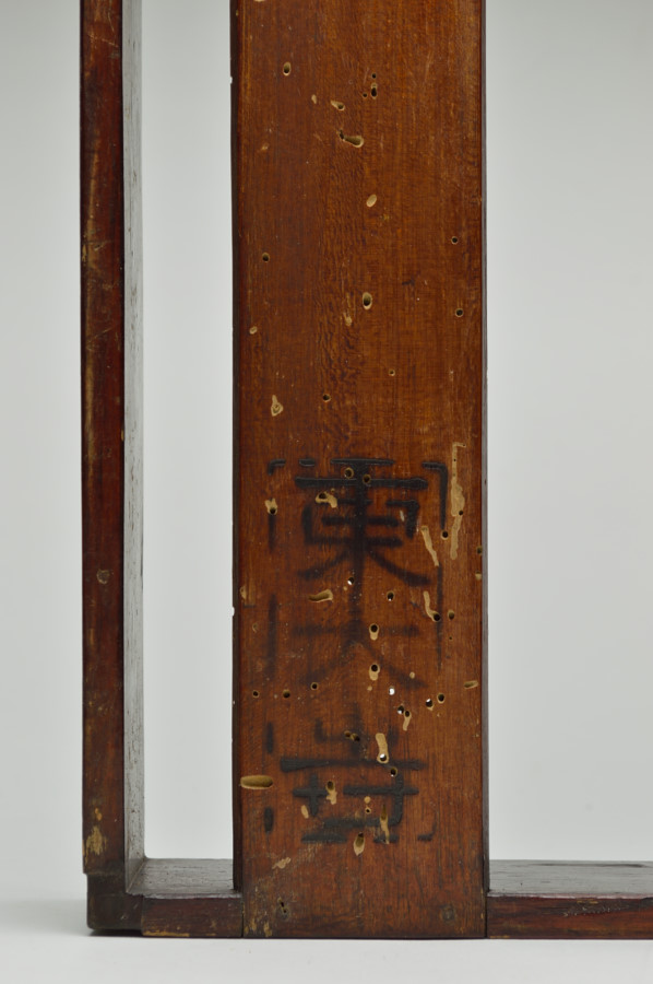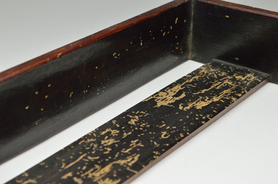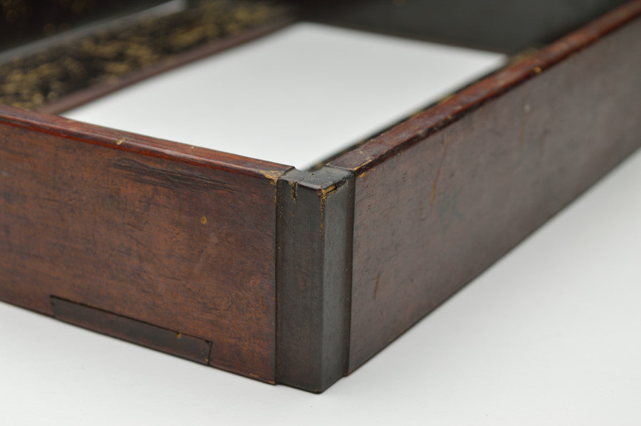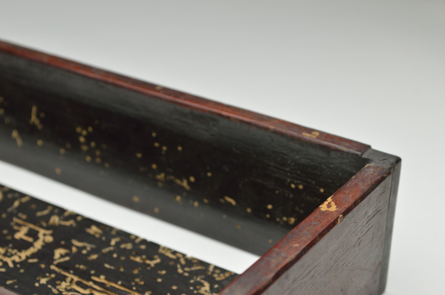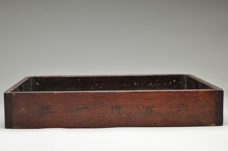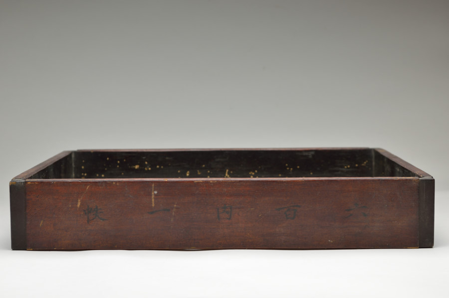 東大寺伝来の経箱。お経を収める箱で重箱のように重ねて収納していたもの。底の板はスノコ状に二本のみで貼られおり、湿気を逃す為と軽量化をはかる為のものでしょう。その板、側面には虫食いがあり、底には東大寺の焼印が有、外側側面には墨書で「六百内一帙」とあり、巻数の多い経を収納していたようです。民間に流れた際に江戸後期の年号、その年に作り直したことも記載された外箱と共に出ており、そのことを考慮すれば、それ以前のものと判断できます。質素な容姿ですが外は拭き漆で堅牢に仕上げられております。桃山〜室町期頃。