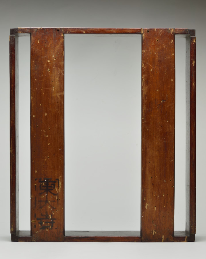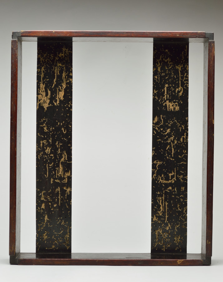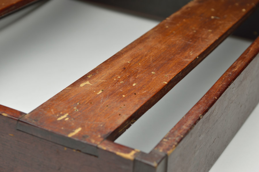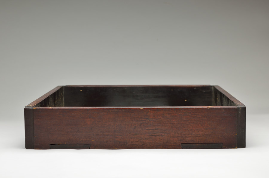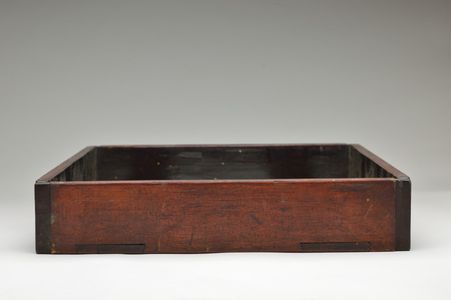 東大寺伝来の経箱。お経を収める箱で重箱のように重ねて収納していたもの。底の板はスノコ状に二本のみで貼られおり、湿気を逃す為と軽量化をはかる為のものでしょう。その板、側面には虫食いがあり、底には東大寺の焼印が有、外側側面には墨書で「六百内一帙」とあり、巻数の多い経を収納していたようです。民間に流れた際に江戸後期の年号、その年に作り直したことも記載された外箱と共に出ており、そのことを考慮すれば、それ以前のものと判断できます。質素な容姿ですが外は拭き漆で堅牢に仕上げられております。桃山〜室町期頃。