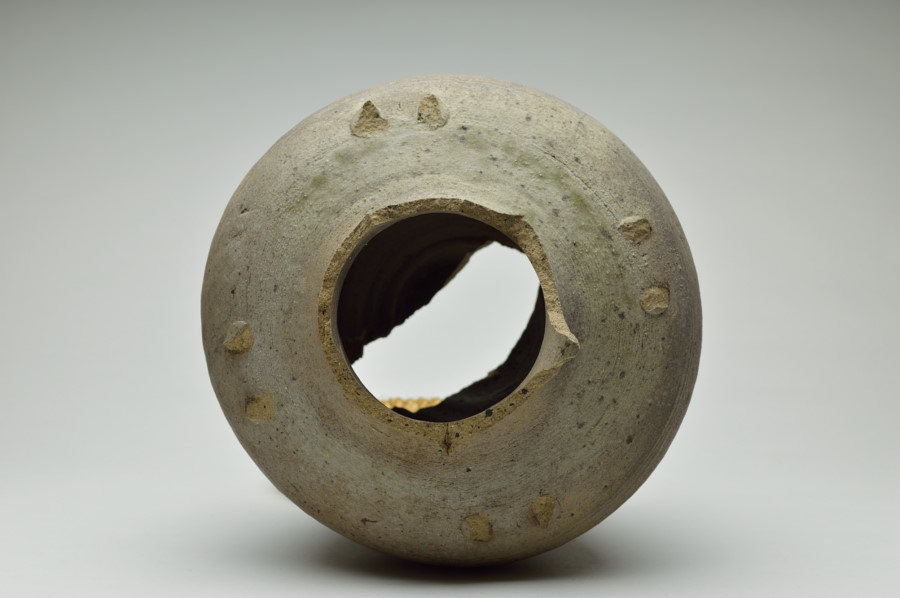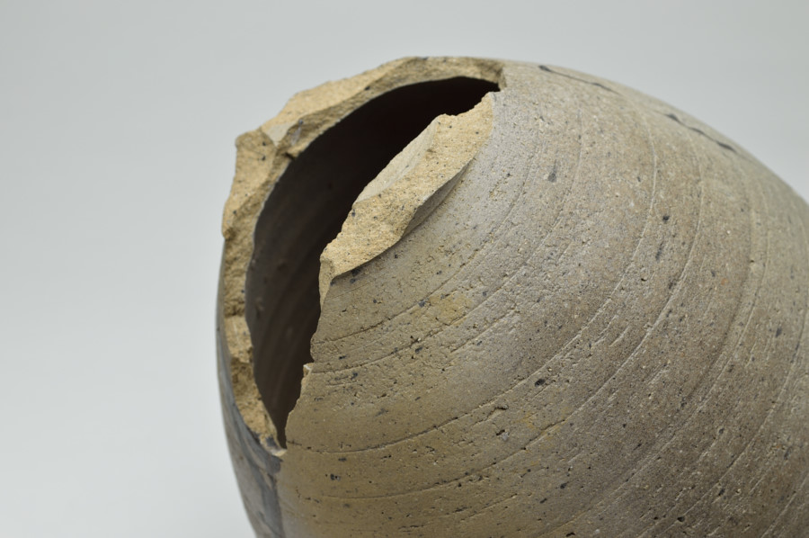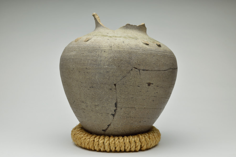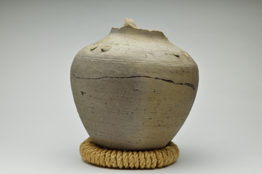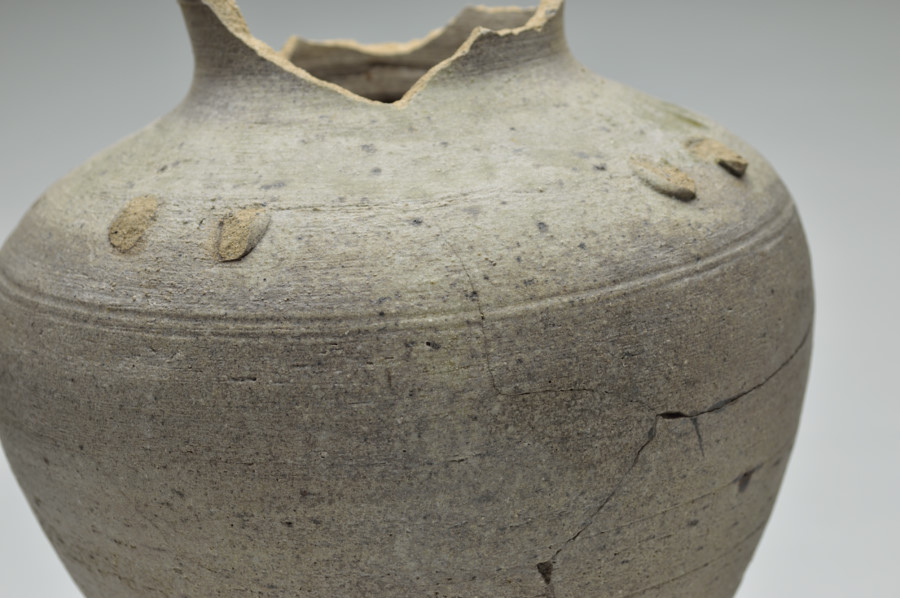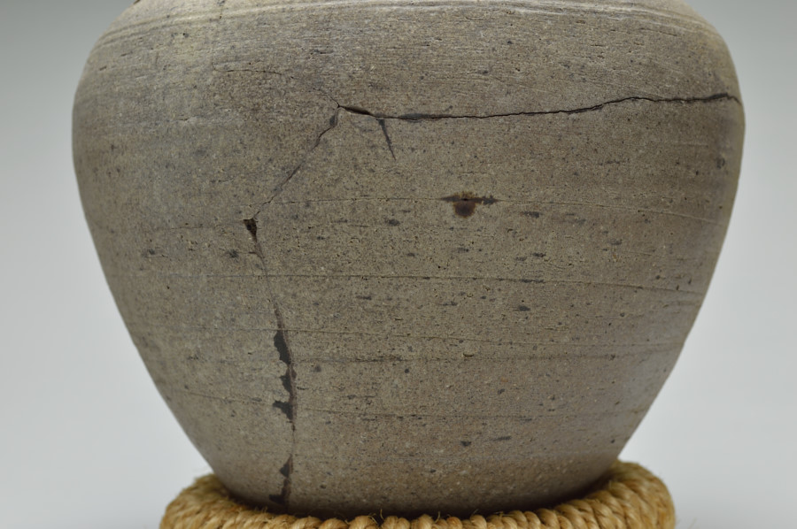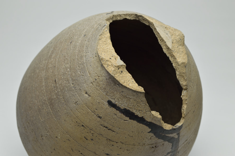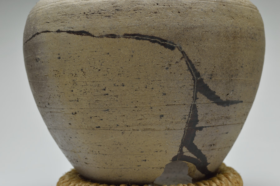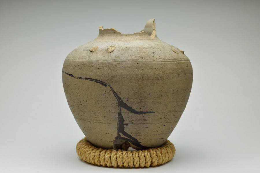 シャープさ、端正で優美な造形、やや肩に降りかかった自然釉、陶片とはいえ形が残る魅力ある須恵器四耳壺です。耳、口、高台、底に欠損、大きく割れ補修がありますが、かろうじて自立しますが、不安定なのでご了承ください。そのまま飾るもよし、瓶を中に入れて花器としても楽しめると思います。