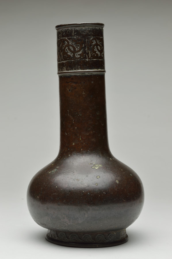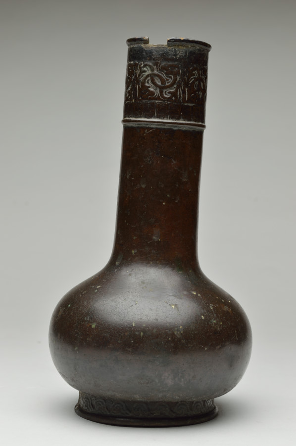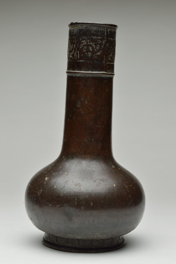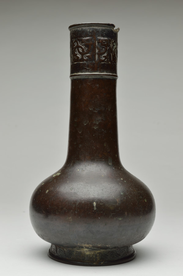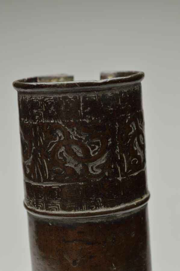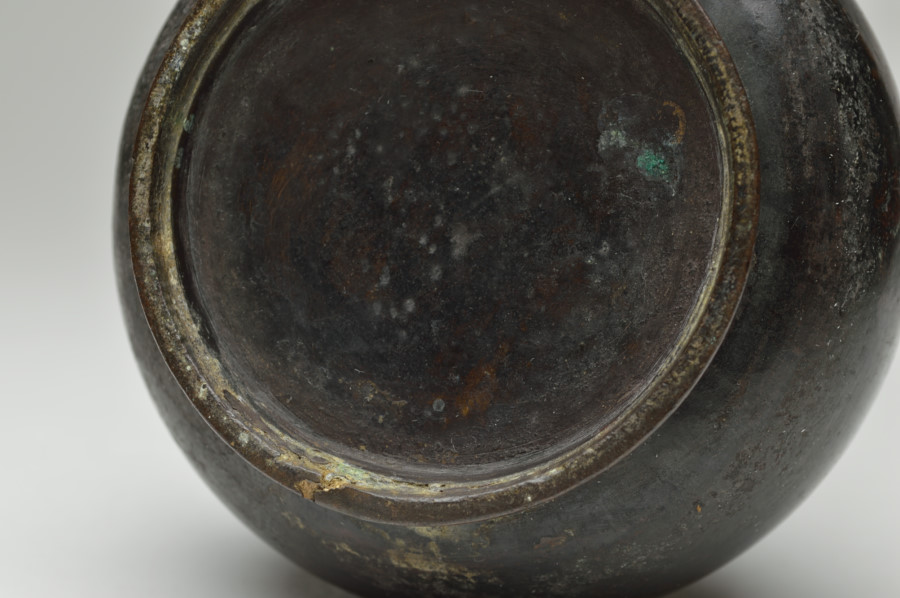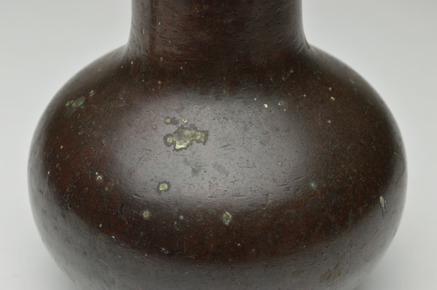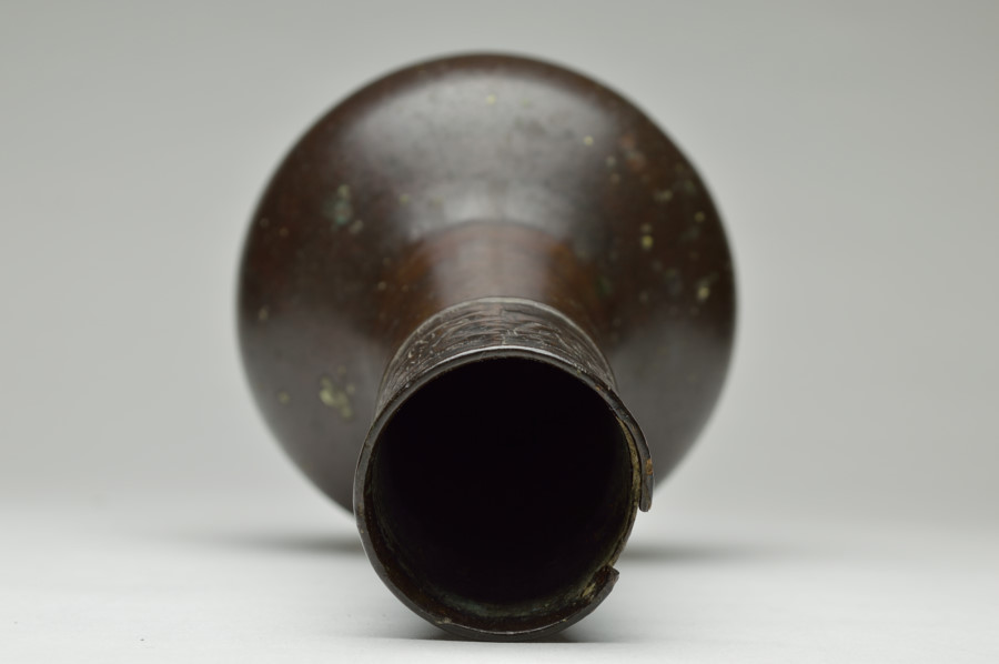 古銅製のどっしりとした安定感のある花器。使い込まれた肌が魅力。耳がないシンプルな造形ながらも存在感があります。やはり、古手の銅の味わいは世です。どんな花も受け入れてくれる使い勝手の良い花器かと思います。縁に欠け、底や胴に直しはございますが、その全体の表情も痛みと感じません。少し傾いており、がたつきがややあります。水漏れはありません。