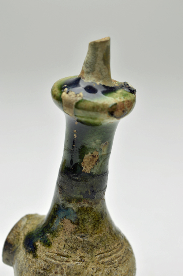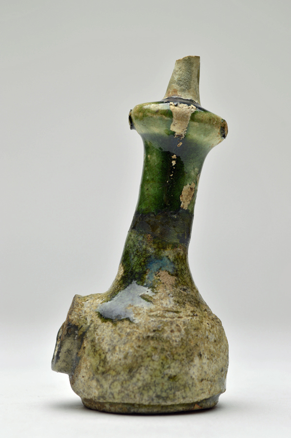 緑釉が綺麗な織部の煙管(キセル)。使用後はすぐに捨ててしまったと言われているもので数が少ないものといわれております。その為、発掘のものが多く、状態が悪いものが多いのですが、この品は釉薬の剥げや少々のカケがあるものの破損は少なく、この時代の織部の煙管では状態が良好なものと言えます。立てて飾ると上部が水瓶のようなに見えて面白いです。桃山〜江戸初。