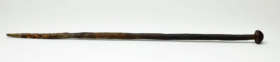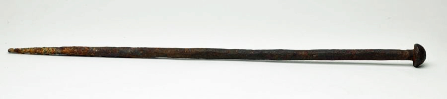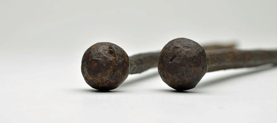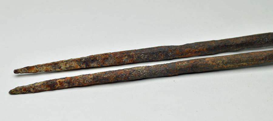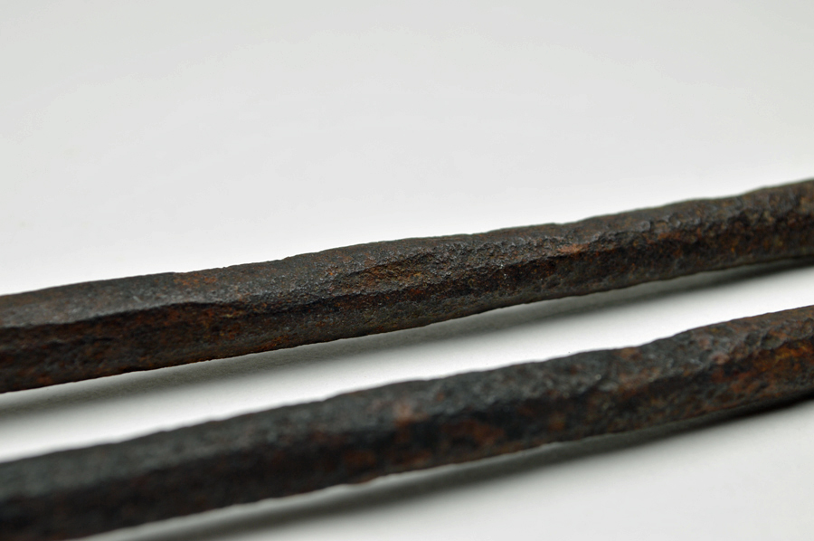 東大寺の鉄釘二本。奈良界隈のお茶の世界では鎌倉時代の大仏殿の釘と言われています。本品は火箸に見立てて使っていたもの。日本の社寺建築では釘を使わないようなイメージがありますが、そんなことはなくそれなりに古くから使われていました。しかしながら、当時のものは、砂鉄を溶かし、鍛えらえた鉄で作られていますので、強靭で、錆がでても黒錆となり鉄の廻りをカバーし劣化を抑える優れた建材。改修などの際に民間にでたものを茶人が火箸として見立てたものと考えます。