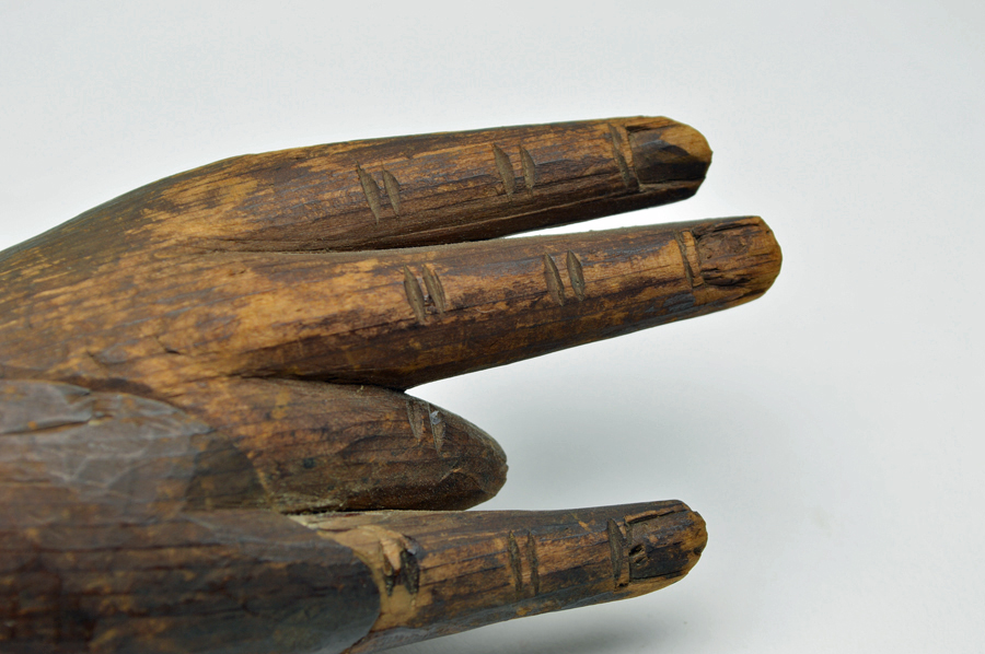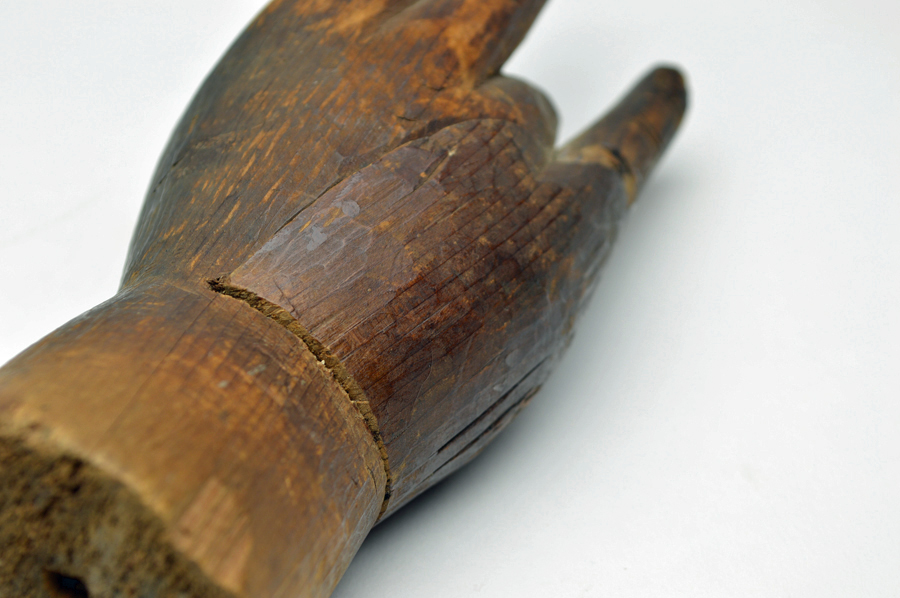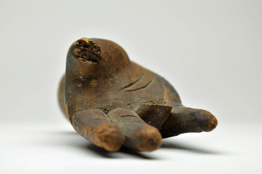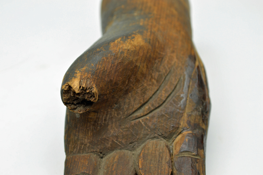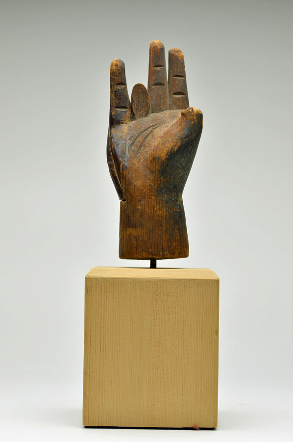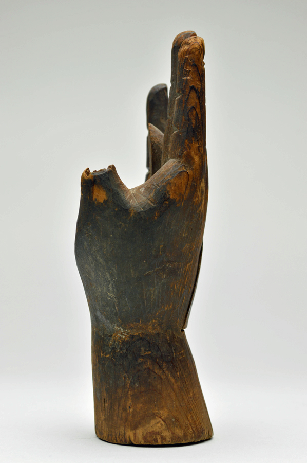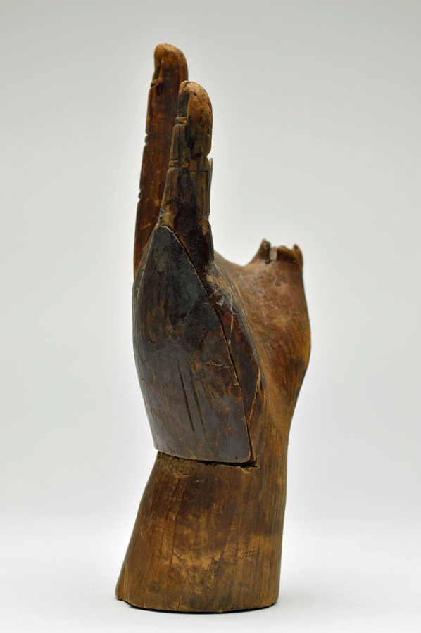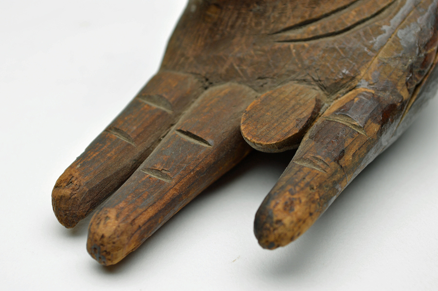 柔らかな表情の仏手残欠。このぐらいの大きさになるとなかなか市場には出てきません。甲の部分の違う材が埋め込まれている部分は後補、親指、薬指に欠損は有。鎌倉〜平安時代。台付。