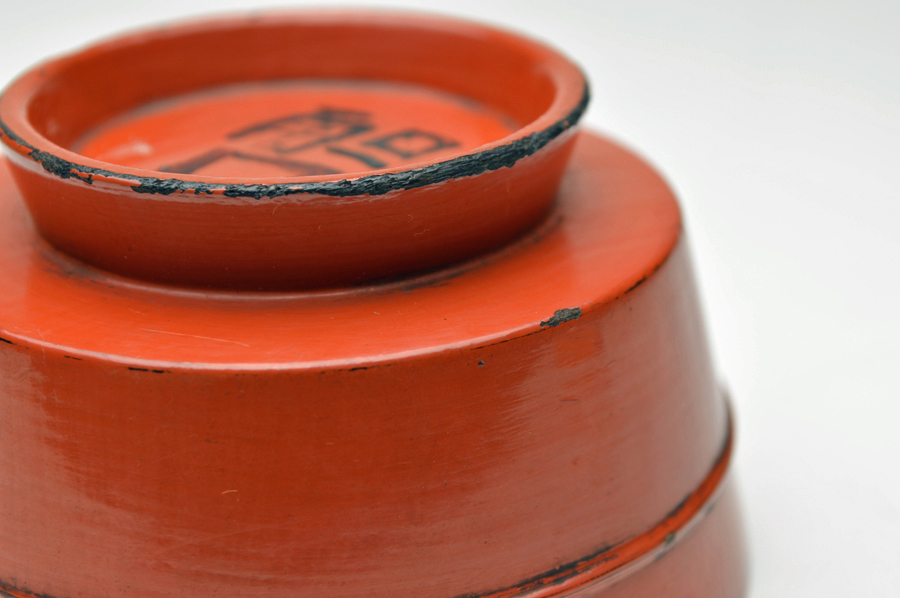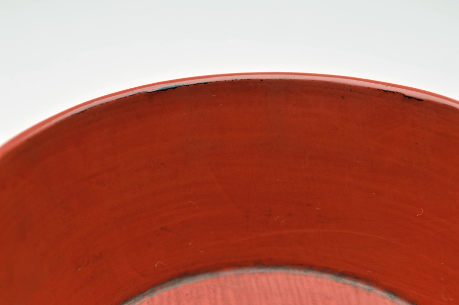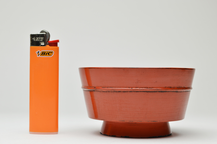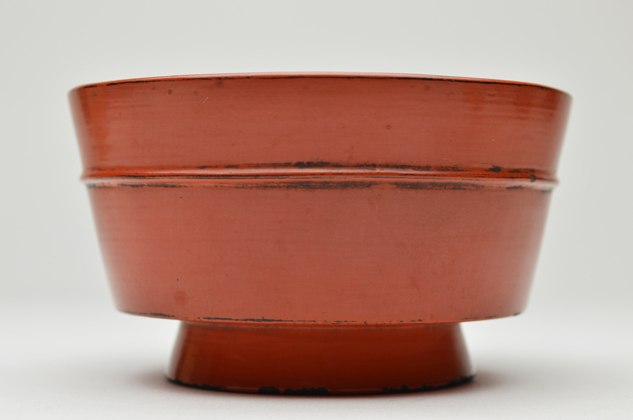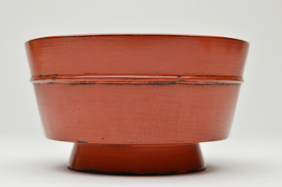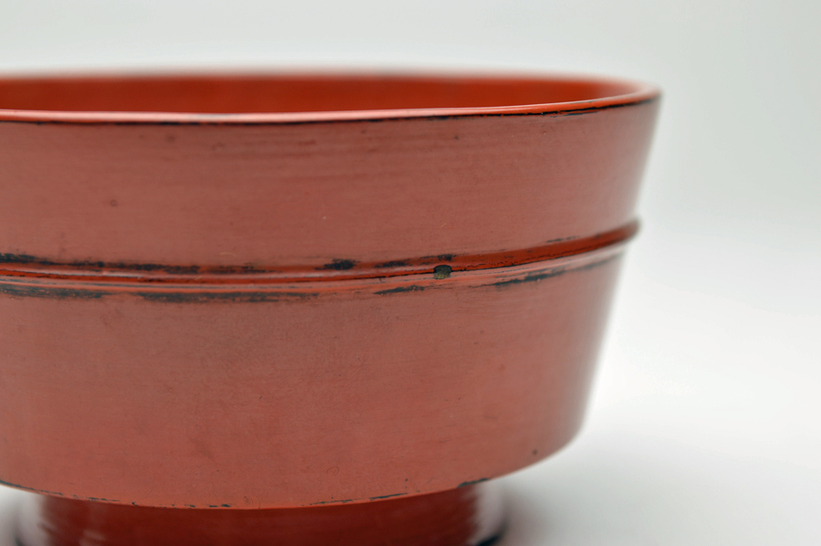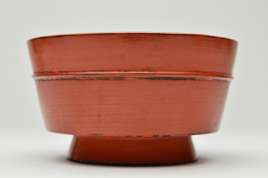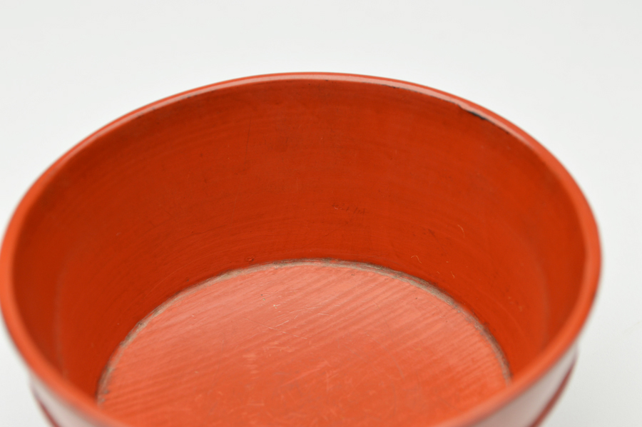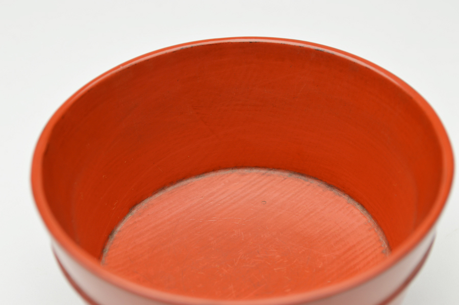 金属器のようなシャープな造形の根来豆子。本来は向付の生まれと言われていますが、盃としても使われていたそうです。大きな痛みもないのですので十分盃としてお使いいただけます。丸みを帯びたタイプは目にすることがありますが、この形は珍しいのではないでしょうか。下地に布が被せられ非常に上手の作りで推測ですが紀州根来ではなく奈良根来と呼ばれるものかもしれません。紀州のものよりやや朱の色が濃いような気がします。浅学の為、断定はできません。桃山〜江戸初。