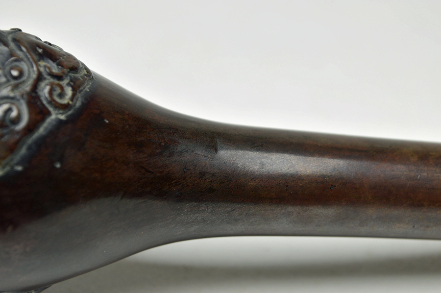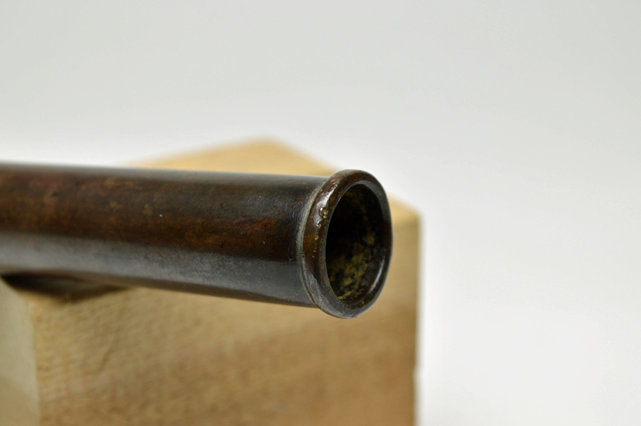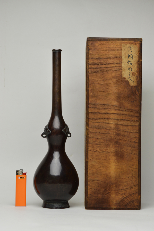 瓢箪形で、長い頸が特徴の古銅花入。両耳は象の顔しており、鼻が耳を兼ねています。柔らかな肌は丁寧に仕上げられており、この手では比較的大ぶりなものですが見た目の印象は大きく主張していません。花より、前に出ない程よい存在感です。凹みが一箇所、古い時代の補修があります。水を張りましたが問題はありませんでした。古格ある品の良い花器です。共箱ですが真田紐はありません。江戸時代。