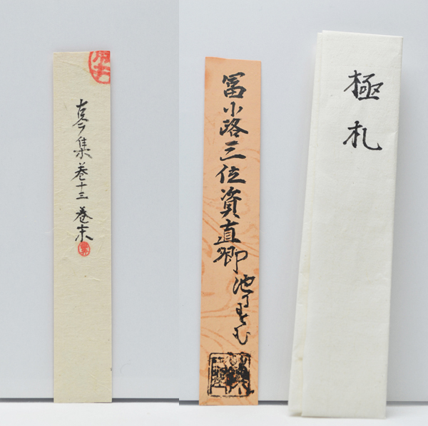富小路三位資直【室町中期末の公卿・歌人。】の古今和歌集 巻十三 巻末 書写。極札・藤井隆。裏打が施されています。大きな破れなどはなく 、状態は概ね良好。